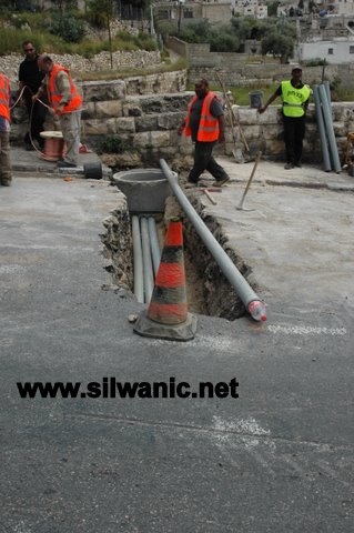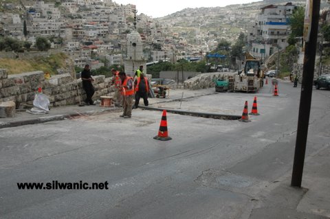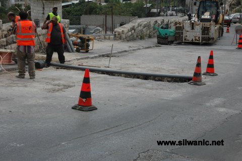 عمال وآلات شركات بلدية القدس يعملون في شارع وادي حلوة بالقرب من مسجد عين سلوان