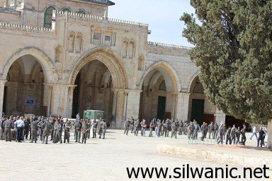 اقتحم العشرات من الجنود الإسرائيليين بعد ظهر اليوم الاثنين ساحات المسجد الاقصى من باب المغاربة، بحماية الشرطة الإسرائيلية، وذلك تزامنا مع عيد "نزول التوارة" اليهودي.وأفادت مصادر الاوقاف أن 186 جنديا إسرائيليا قاموا بالدخول الى الأقصى من باب المغاربة بزيهم العسكري، وتجولوا في ساحاته ولدى وصولهم الى ساحة قبة الصخرة المشرفة قاموا برفع العلم الإسرائيلي، الذي حجمه 3 امتار.وافاد شهود عيان ان الجنود اقتحموا الأقصى عبر مجموعتين ، والتقوا على سطح الأقصى وهتفوا جمعيا بصوت واحد "جبل الهيكل.. جبل الهكيل"، كما رقصوا على سطحه، ويعتبر ذلك احتفالا بعيد "نزول التوارة." وأضافوا أن عدد من مسؤولي الاوقاف تدخلوا على الفور وحصلت مشادات كلامية بينهم وبين الشرطة التي رافقت الجنود، واضطرت الى اخراجهم على الفور من المكان حينما وردت انباء عن تحركات بالشارع المقدسي.وفي اتصال هاتفي مع الشيخ عزام الخطيب مدير دائرة الأوقاف بالقدس وصف رفع العلم الإسرائيلي من قبل الجنود بالعمل الاستفزازي والخطير، مُحملا الشرطة الإسرائيلية تبعات الحادث.وحذر الشيخ الخطيب من الوضع في الأقصى، مشيرا انه ارسل كتاب الى قائد شرطة لواء القدس طالبه فيه بمحاسبة المسؤولين عن الحادث.وكان 85 جنديا اسرائيليا قاموا باقتحام المسجد الاقصى بزيهم العسكري بتاريخ 21-5-2012.وفي سياق متصل سمحت الشرطة الإسرائيلية ل88 متطرفا إسرائيليا بالدخول الى الأقصى اليوم ضمن برنامج (السياحة الاجنبية) للمسجد.