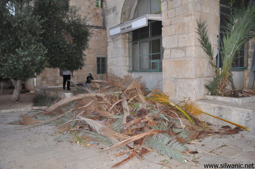 وأوضح شهود عيان لمركز معلومات وادي حلوة أن شخرة النخيل وقعت مساء اليوم بشكل مفاجأ بالتزامن مع تحضير وجبات الإفطار في ساحات الأقصى، وعلى الفور تم تنظيف المنطقة لعدم اصابة المصلين بأذى، حيث قطعت اغصان الشجرة ونقلت من المكان.
