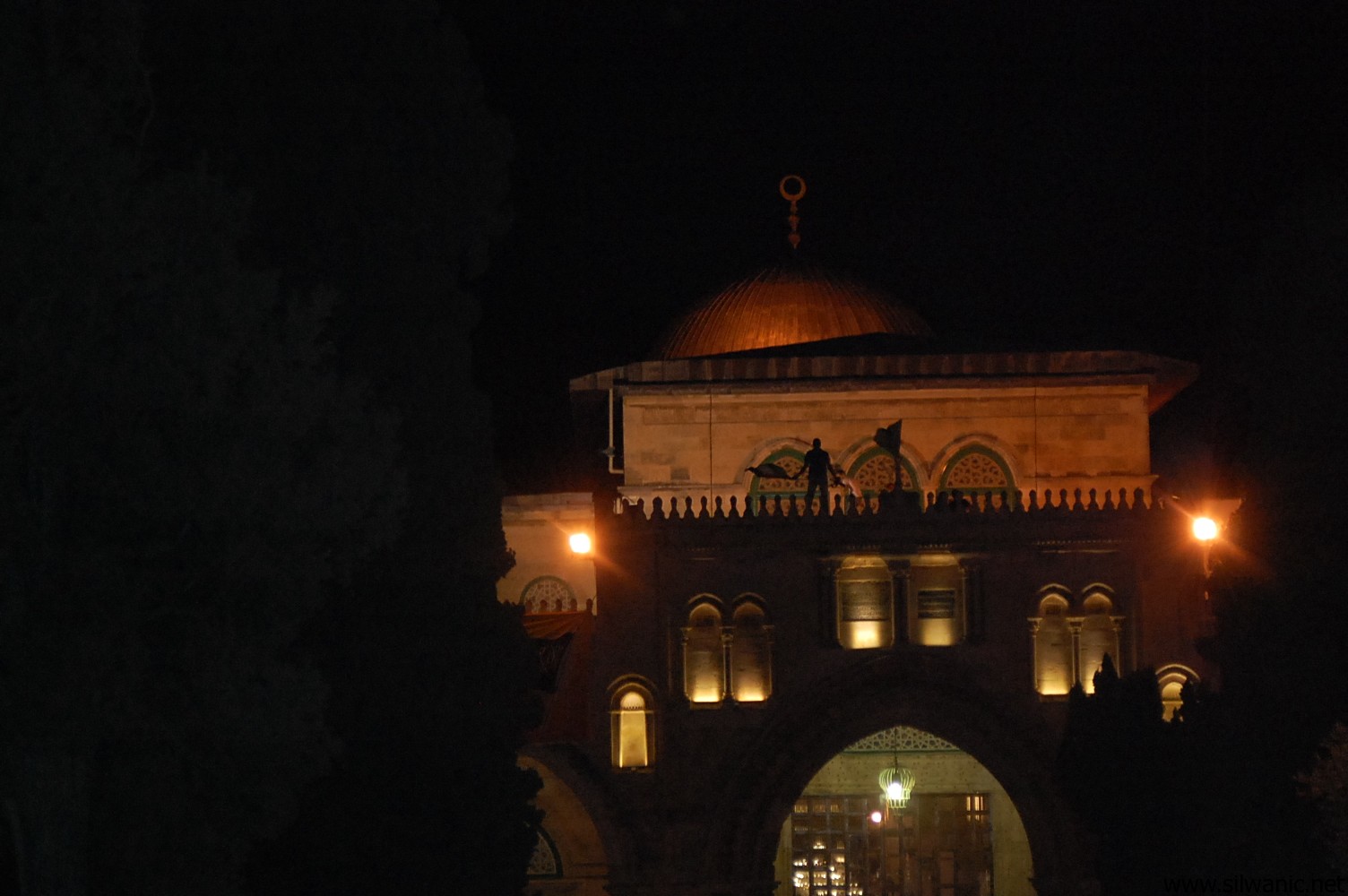 ورفرفت الاعلام الفلسطينية ورايات اسلامية فوق المسجد الاقصى المبارك طوال صلاة التراويح .