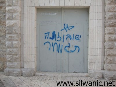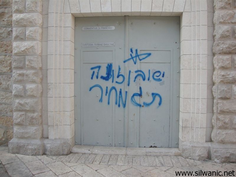 قام يهود متطرفون اليوم الثلاثاء بكتابة عبارات مسيئة للسيد المسيح عليه السلام باللغة العبرية على بوابة دير الفرنسيسكان الواقع في جبل صهيون بالقدس القديمة.