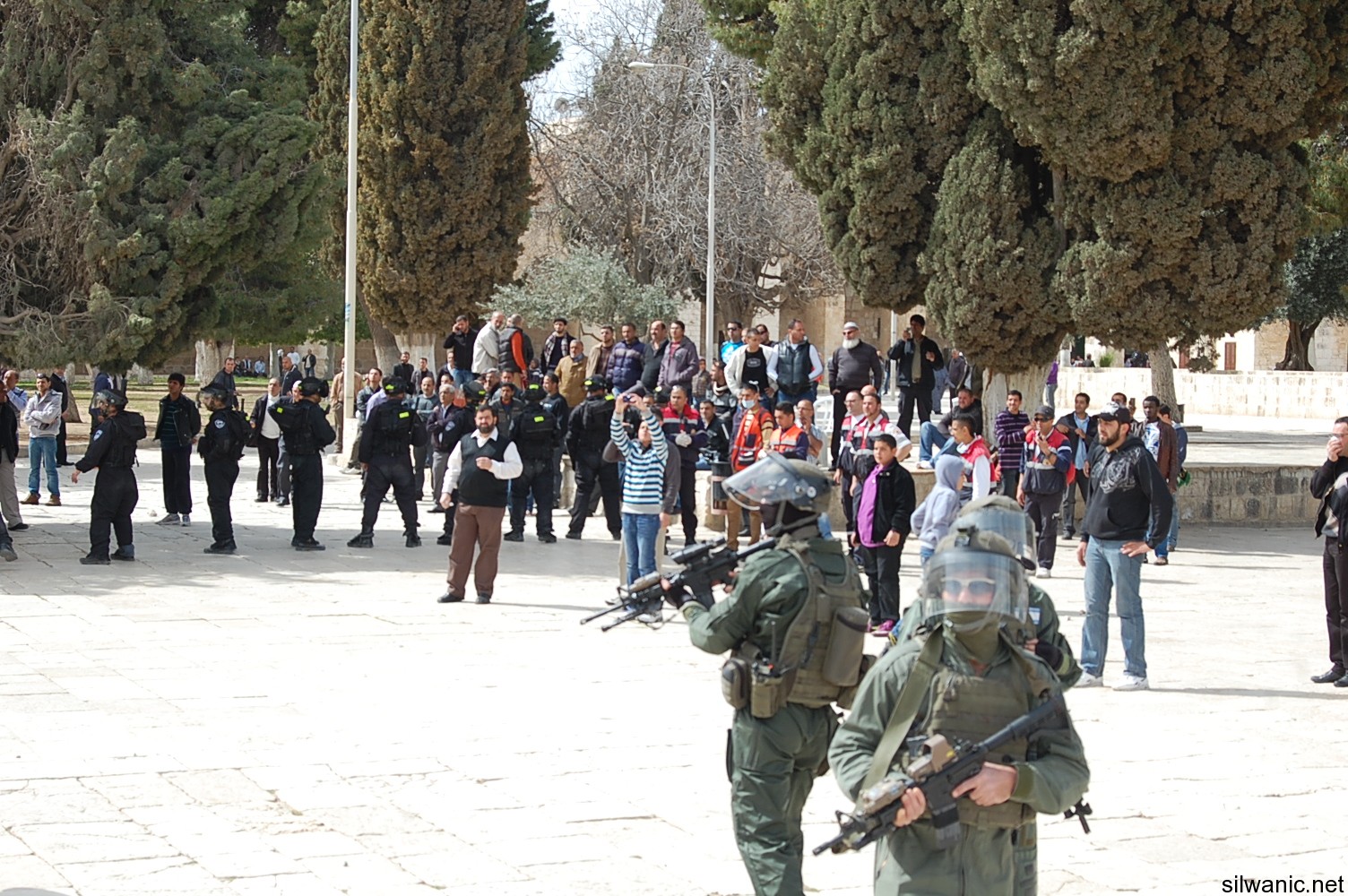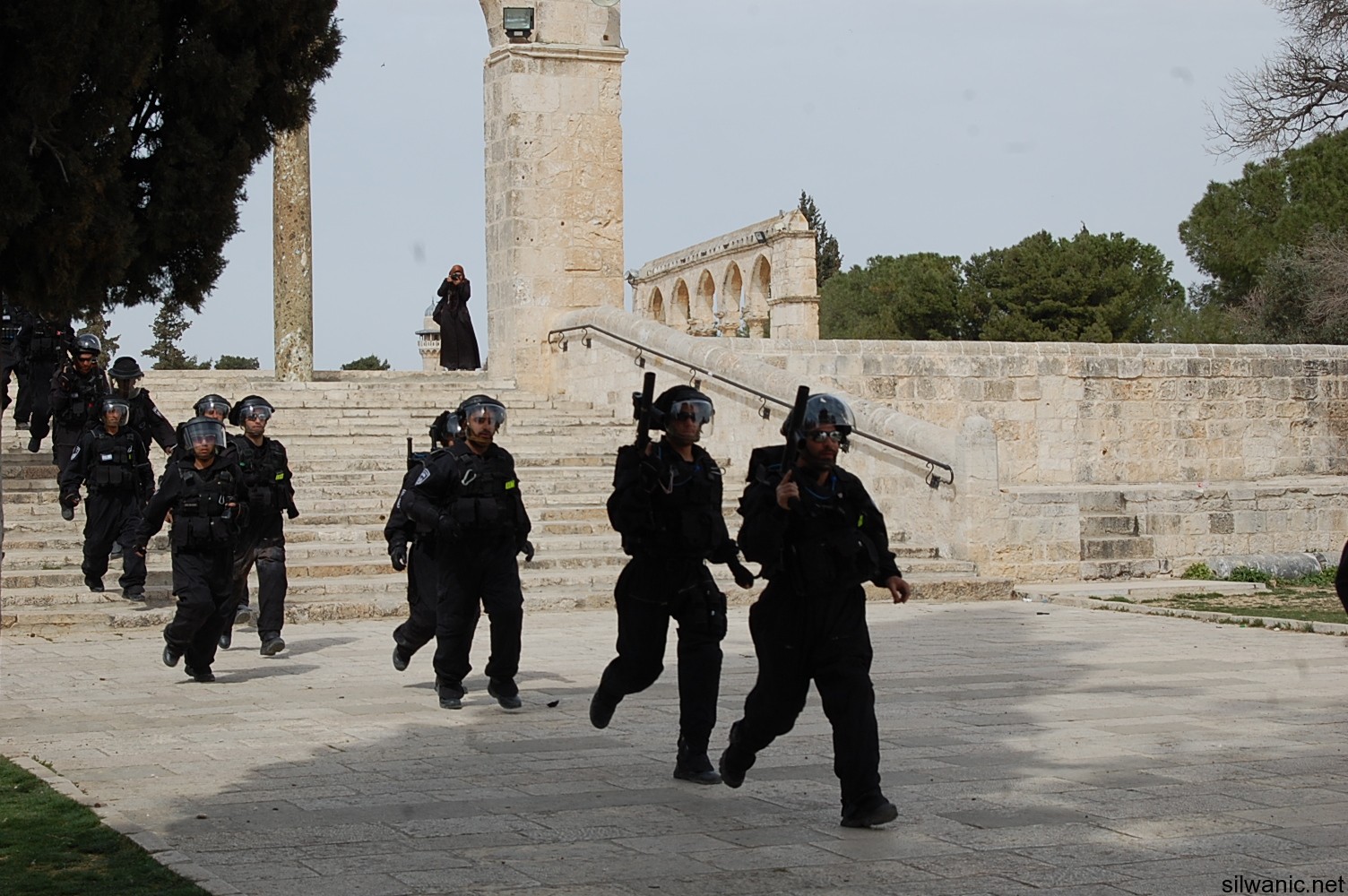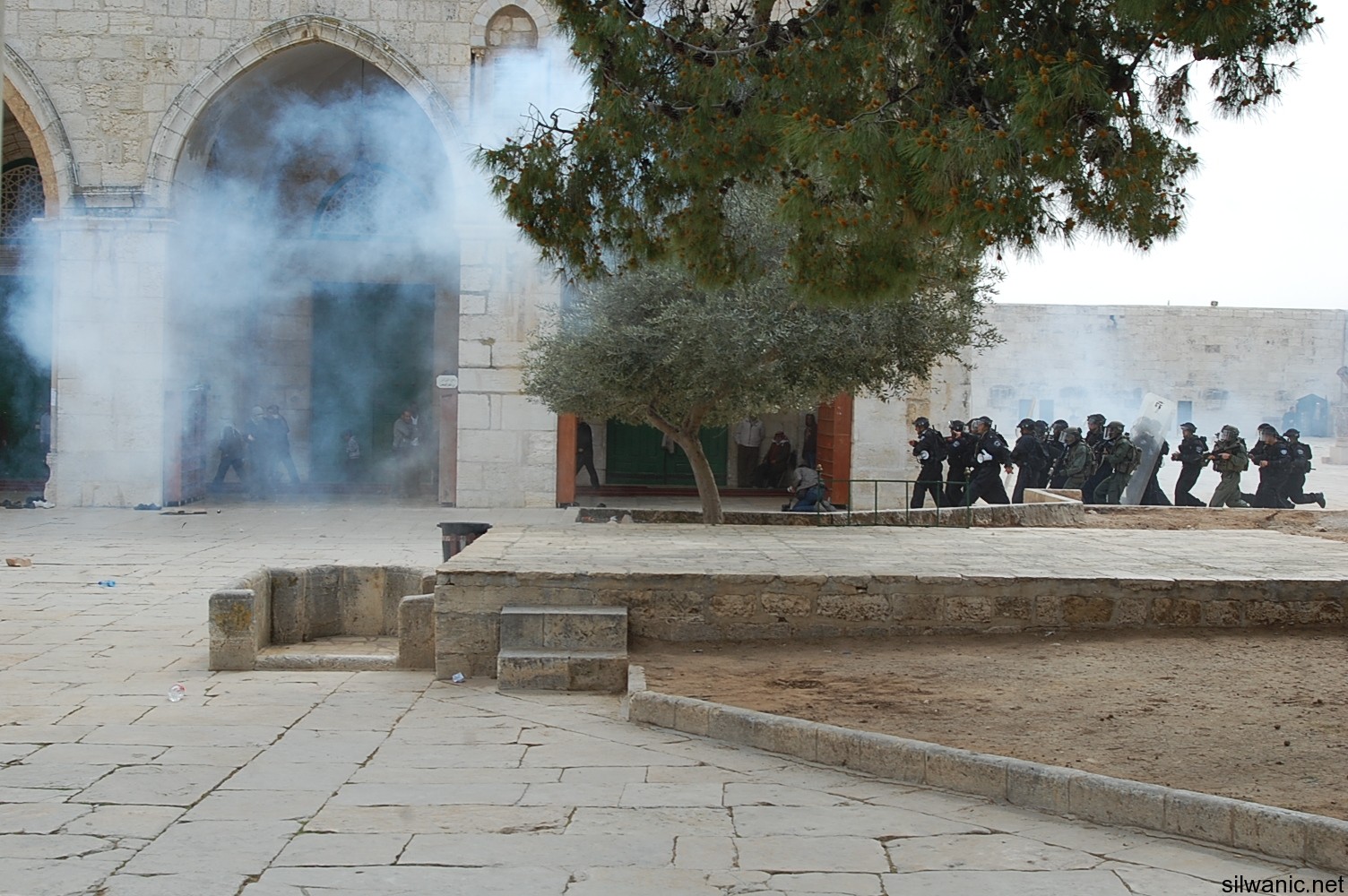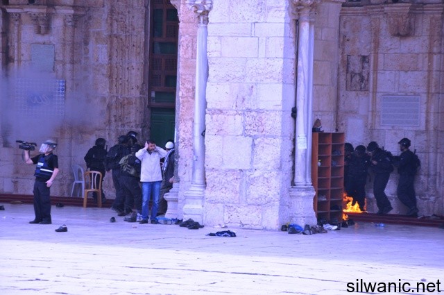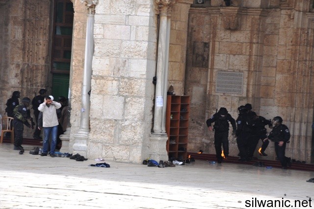 وقامت القوات الاسرائيلية باقتحام ساحات المسجد الاقصى من باب المغاربة، وباب السلسلة، من الشرطة الاسرائيلية والوحدات الخاصة والمقنعة والمستعربين والمخابرات الاسرائيلية، والقت باتجاه الشبان الاعيرة المطاطية والقنابل الصوتية، كما حاصرت العشرات من المصلين بالمسجد القبلي ووضعت السلاسل على أبوابه، وحاولت القوات اقتحامه عدة مرات، الا ان الشبان الذين
