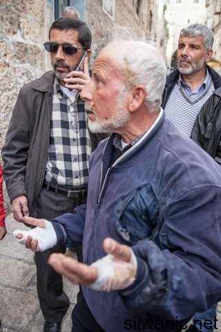 أما الحارس صالح دويك 63 فقد قال:" اثناء تواجدي على أحد أبواب مسجد قبة الصخرة، تم القاء قنبلة صوتيه فأصبت بوجهي وعند وضعت يدي على خدي، اصيبت بالقنبلة الثانية، كما حرقت سترتي."
