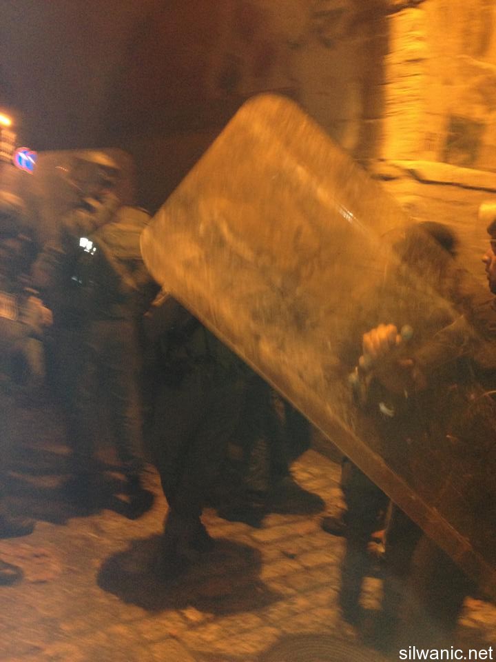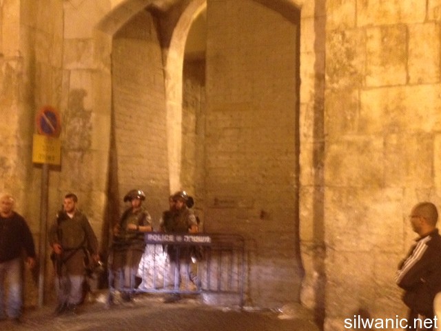 Clashes broke out in Bab Hutta neighborhood which is very close to Al-Aqsa mosque between the Israeli forces and youths from Jerusalem. The number of detainees rose to seven and they are: Ra’fat Ajloni, Jihad Abu Khroub, Husam Sider, Ammar Alrazem, Isam Alqabani and his brother Rami and Sameer Abu Rajab. The Israeli forces randomly fired rubber bullets and sound bombs in Bab Hutta injuring several young men. Witnesses said that the clashes began after stopping one of the passers-by and provoking him resulting into verbal altercations, and then the forces beat him severely; and when the other young men stepped in to help him, they were also attacked and assaulted. They attacked Ra’fat Ajloni injuring him in his head. After arresting him, he was transported to Hadassah Ein Kerem Hospital, while Husam Sider was taken to Al-Esawyeh Hospital for treatment after being arrested. The forces also attacked Nabil Abu Khroub who is in his sixties and sprayed him with pepper gas, he was then transported to hospital for treatment; his son Jihad was also attacked and arrested. The Israeli forces raided an internet café and attacked the boys who were inside and forced them to get out and stand outside the shop where they were beaten by batons, hands and legs, knowing that they were between 7-12 years of age. The 58-year old Jihad Muhtaseb got wounded with a rubber bullet while working inside Hutta Gate and was transferred to the hospital; the police then closed Hutta Gate “one of Al-Aqsa gates” and prevented the prayers from entering to perform the night prayer. They also raided several houses in Bab Hutta and damaged their doors and broke the windows. Among the houses that were raided: the house of Hasan Yousef, Alqabani, Alrazem and Najib. The forces also closed Lions’ Gate Street and prevented the cars from passing. The police completely closed Lions’ Gate which is one of the main gates of the Old City and prevented the residents from going through, knowing that their houses are inside the Old City.
