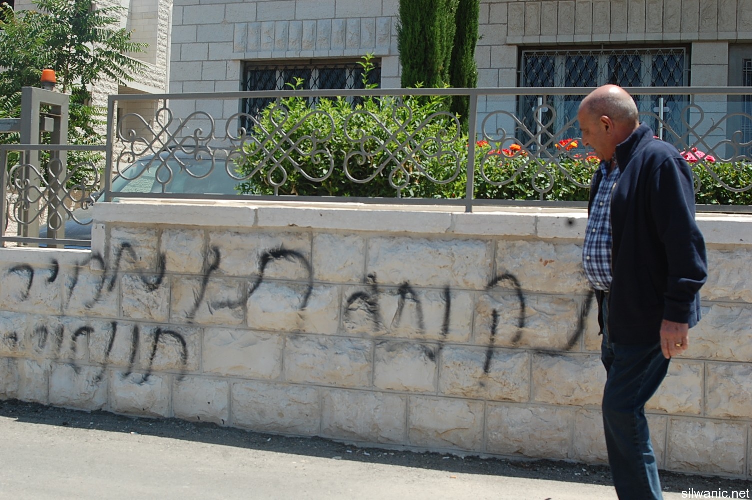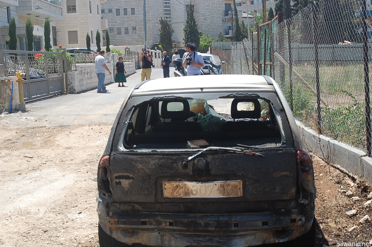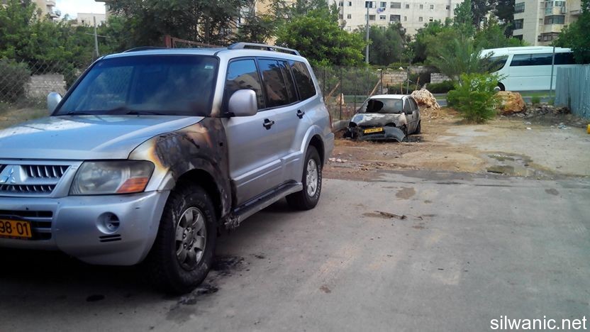 Extremist settlers burnt two cars belonging to Jerusalemites in the neighbourhood of Sheikh Jarrah in east Jerusalem on Friday early morning hours. They also wrote “payback” slogans in Hebrew on the wall of a residential building. The surveillance cameras installed on one of the residential buildings in the area monitored four settlers as they invaded a street in the neighbourhood of Sheikh Jarrah in Jerusalem around 2.30 a.m. and one of them started writing racist slogans on the outside wall of a residential building (payback, revenge, etc…), while the other three poured flammable liquid on two cars and set them on fire; the cameras revealed the attempt to burn a third car. Mousa Alami explained that upon arrival to the neighbourhood with his friends, the two cars were already burning and they were able to extinguish one of them but failed on the second one. He also pointed out that the police along with the fingerprints experts, intelligence and fire extinguishing team arrived at the scene and took pictures and investigated the accident.