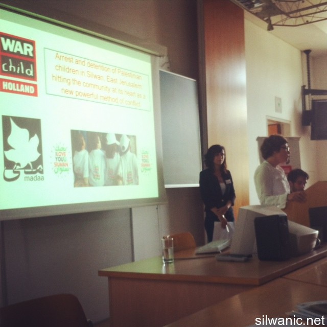 A conference under the name of “children and war: past and present” was held lately in Salzburg University in Austria. Waed Ayyash, a representative from “Wadi Hilweh Information Center” and Francesca Bombay who was representing “War Child, Holland” participated in the conference. Waed and Francesca gave a presentation about the lives of children in Silwan who are exposed to daily violations that contradict with the international laws and norms. The presentation started with showing a short documentary film on the lives of children who live in Silwan where each child talked about his suffering. Waed, who is an Occupational Therapist in Madaa Center, talked about the village of Silwan and the suffering of its children and residents and the psychological effect of arrests on the children; she also gave a brief on the work of Madaa Center and Wadi Hilweh Information Center. Francesca explained in her lecture the methods of arresting children in Silwan, noting that most of the arrests are performed at night after the Israeli forces raid the child’s house and take him alone in the police car and then onto the investigation rooms where the first investigation is conducted without the presence of any of his parents, not to mention their situation in the cells, stressing that it is incompatible with the international laws to protect the rights of the children. Several lecturers, researchers and specialized people in children affairs also participated in the conference along with representatives from human and legal international institutions.