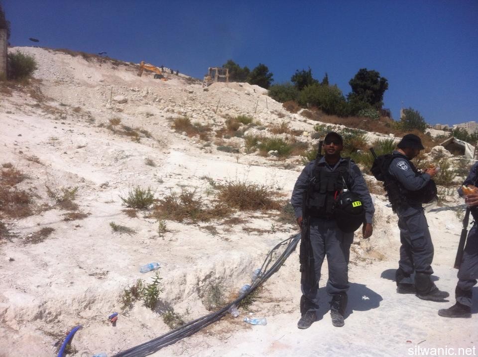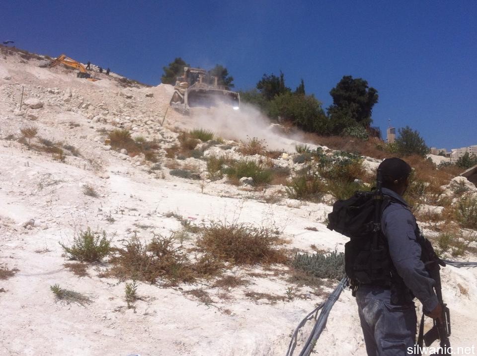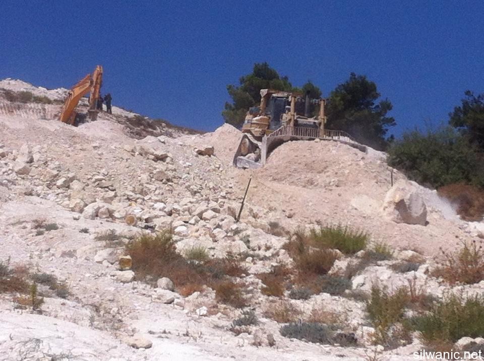 Under heavy protection from Israeli forces, the bulldozers of Nature and Parks Authority swept on Wednesday morning wide areas of lands in Khallet Al-Ein near Al-Tur, east of Jerusalem. Locals of the area explained to Wadi Hilweh Information Center that a large Israeli force raided the area of Khallet Al-Ein around 6 a.m. The force surrounded the area and prevented the citizens and owners of the lands from getting to the lands that will be swept, and then started the sweeping process. Mufeed Abu Ghannam, head of follow-up committee in Al-Tur, said that the Israeli bulldozers swept 20 Dunoms from the lands of Khallet Al-Ein in Al-Tur that are owned by the families of Khweis and Al-Sayyad. He explained that the sweeping process included removing 30-year old fruitful trees in addition to removing trees saplings as well as demolishing dirt hills in the lands. Abu Ghannam confirmed that the locals have orders from the Israeli courts to freeze the works in the lands of Al-Tur and Esawyeh until there is a decision regarding the project submitted by the locals, but the Nature and parks Authority already swept the lands four times in 2012-2013. He also said that the bulldozers demolished eight houses in the area this year in addition to the existence of 48 houses that are at risk of being demolished in those lands in order to inplement the “National Park” project. Ahmad Sub Laban, a field researcher, explained that the sweeping process led to the sweeping of the main road leading to the houses of Tarek Gheith and Ali Gheith where 16 individuals live in which most of them are children and are currently suffering to reach their homes and are forced to go through dirt hills and pass through rocks because of the severe slope in the area. He also added that the Israeli authorities intend to execute the “National Park 11092 A” project in Al-Tur and Esawyeh through seizing 740 Dunoms from the lands of the locals, knowing that the municipality, Nature and Parks Authority and Jerusalem Development Authority have submitted the National Park project in 2009. The project was approved in December of 2009 after it satisfied the initial conditions and in January of 2010 the local committee decided to expand the project to the North and North West. In April 2010, the Israeli District Committee to organize and construct ratified the project with a total area of 740 Dunoms.