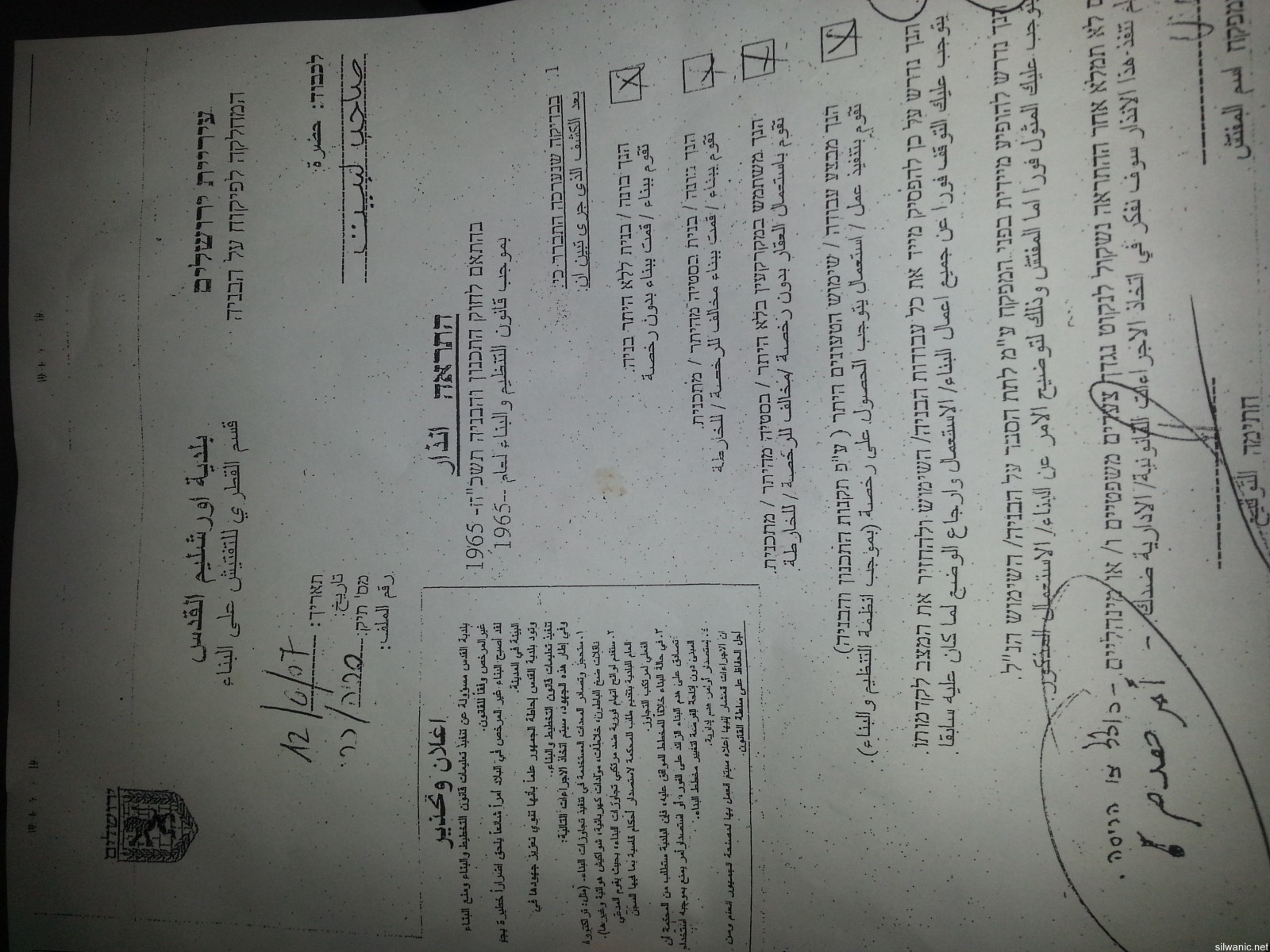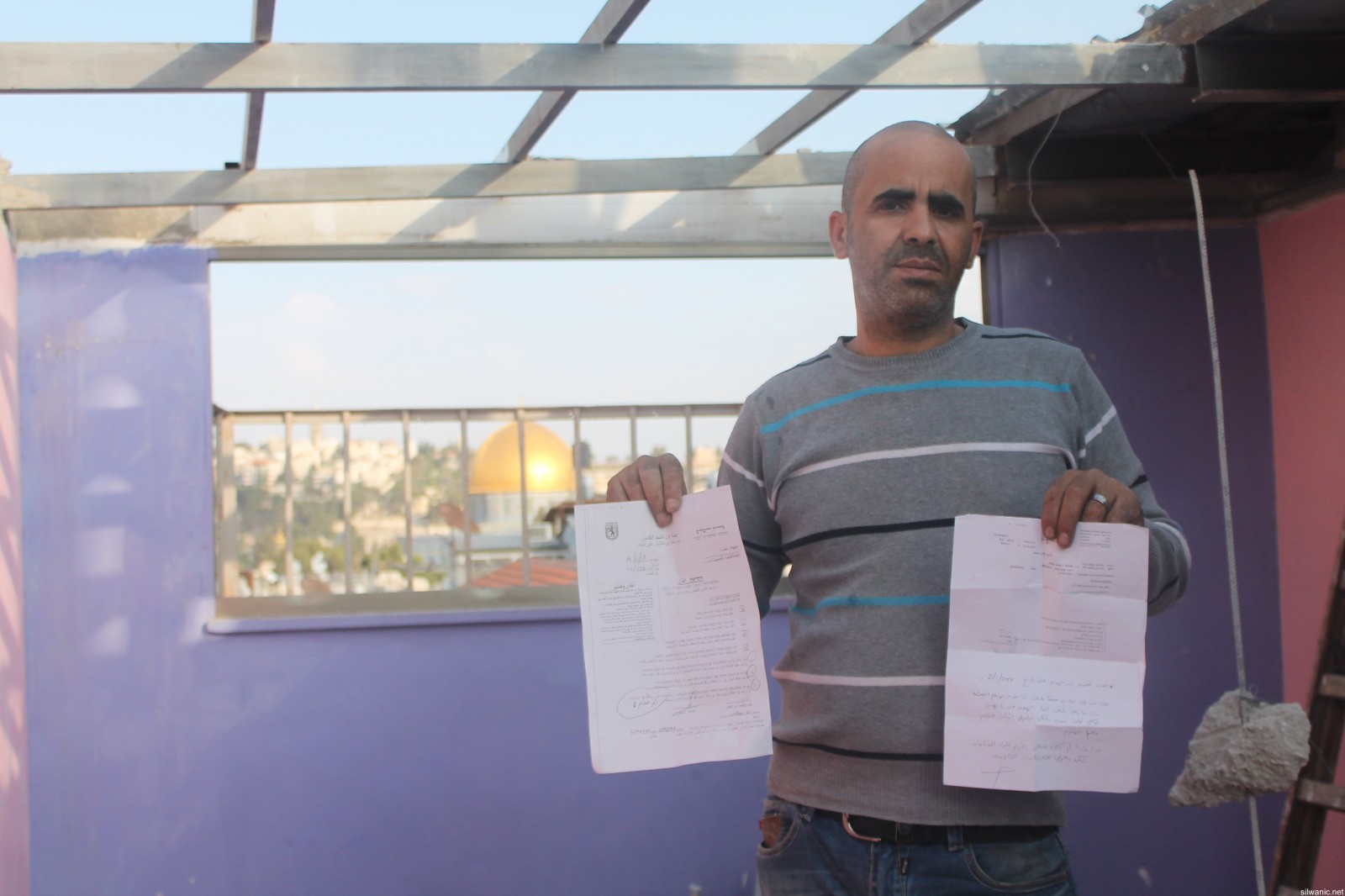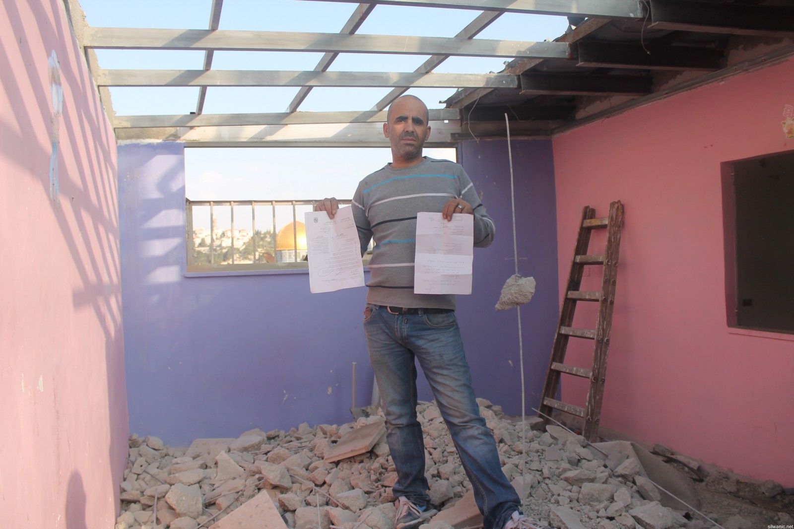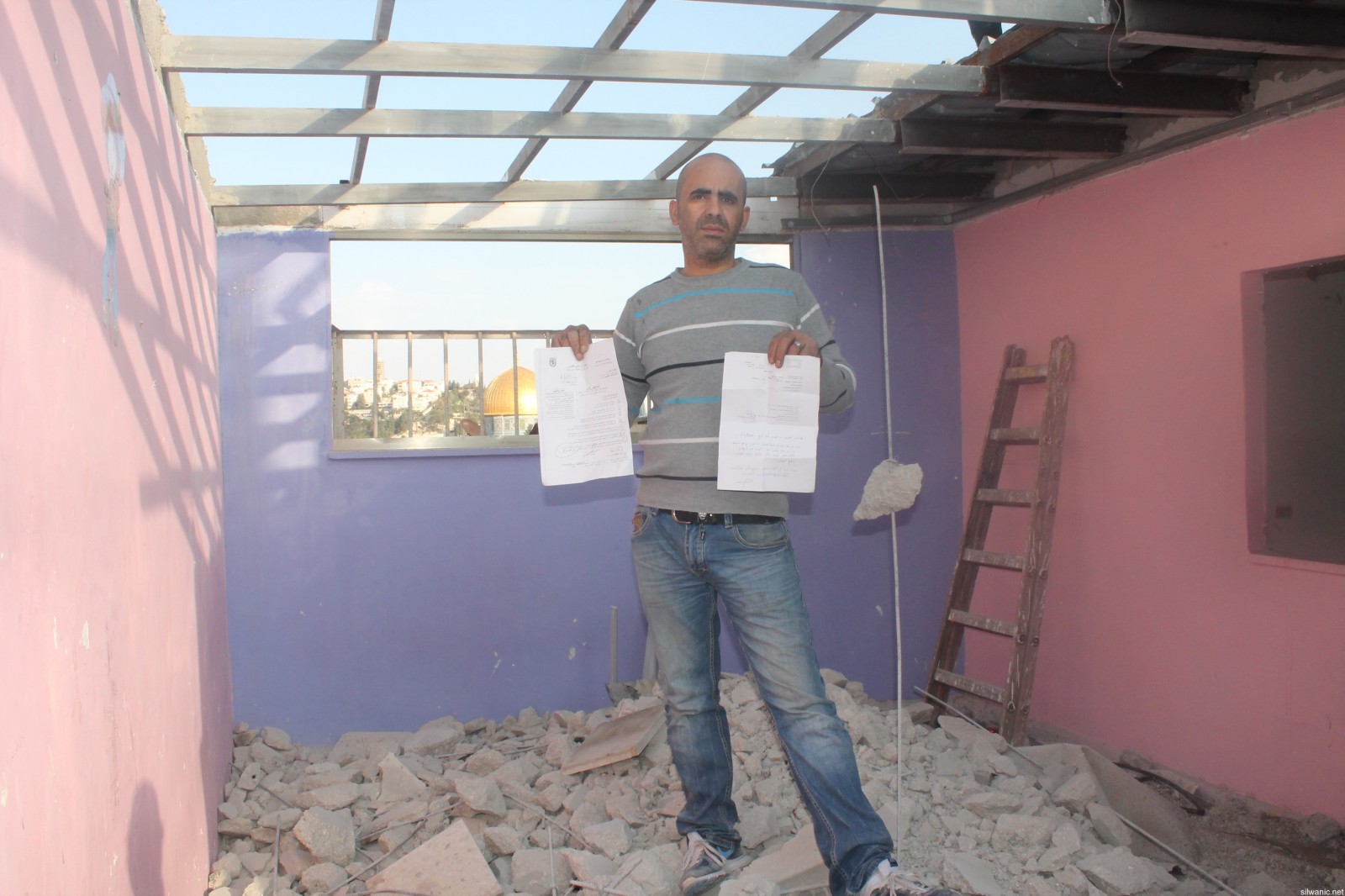 Citizen Samer Za’tara executed the occupation’s decision on Saturday and self-demolished his home in Oqbat Al-Saraya in the old city of Jerusalem to avoid paying the high demolition costs. Za’tara explained to Wadi Hilweh Information Center that the occupation’s municipality issued their final decision two weeks ago which requires him to self-demolish his home. Otherwise, the special municipality crews will demolish it on his own expense which could be as much as 80-90 thousand NIS. He added that his house consists of two floors (three bedrooms and a bathroom) and it was built as an addition to an old family’s building 18 years ago. Three years ago, the municipality issued their first demolition order and he was able to postpone it until last Saturday and had paid building violation fees of 12 thousand NIS. Za’tara said that he lives in the house along with his wife and six children (oldest is 16 and youngest is one) noting that the municipality gave him until the beginning of next February to execute the demolition order. Za’tara appealed for the officials to provide him and his family with a place to stay; especially that he has been unemployed for some time now.