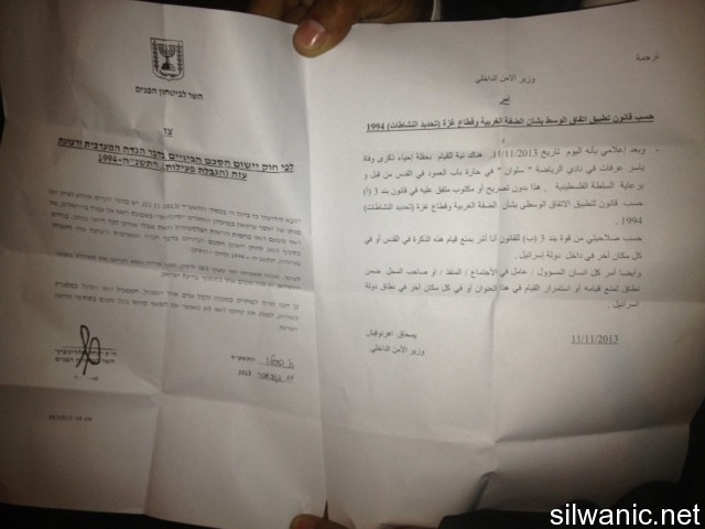 وعلم مركز معلومات وادي حلوة أن القوات الاسرائيلية أًخرجت المتواجدين من مقر نادي سلوان، وعلقت على بوابته أمرا موقعا من وزير الأمن الداخلي "اسحاق أهرنوفتش" يقضي بمنع تنظيم فعالية " احياء ذكرى وفاة ياسر عرفات"، بحجة رعايته من قبل السلطة الفلسطينية.