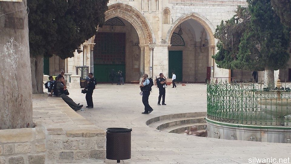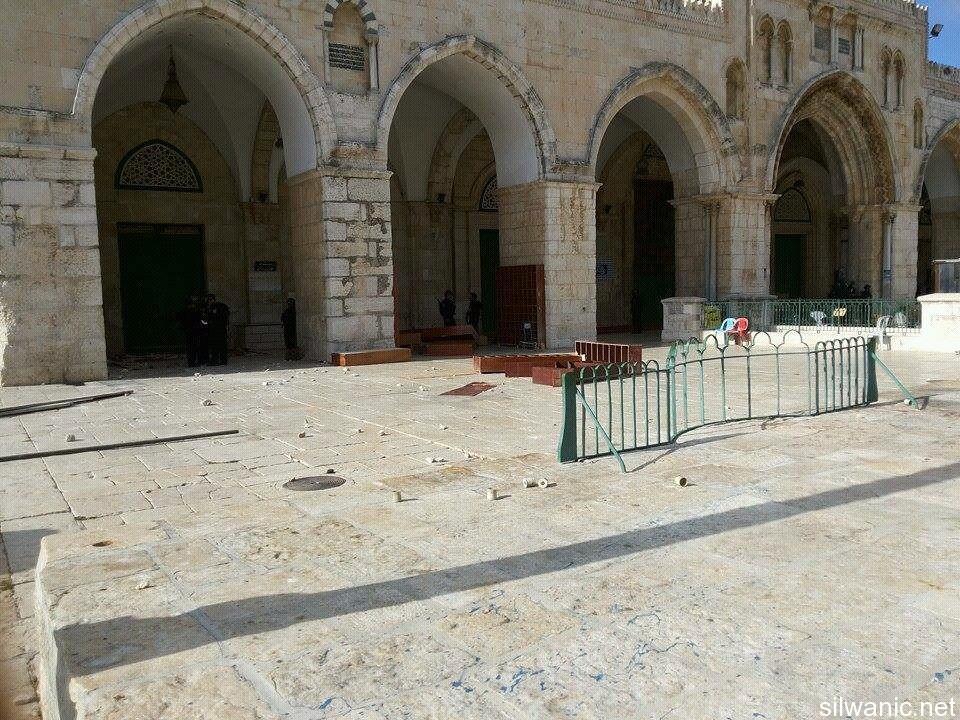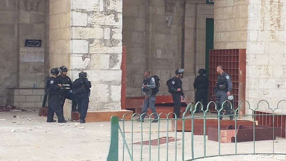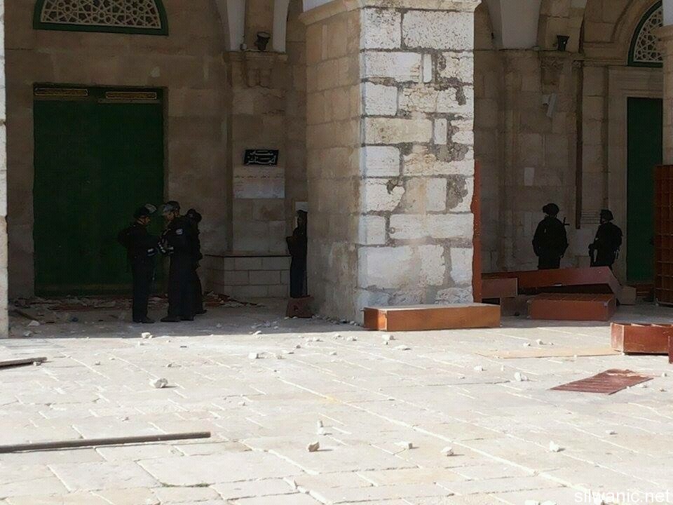 وقامت القوات الإسرائيلية الساعة 7:30 صباحا باقتحام الأقصى أثناء تواجد أعداد قليلة من المصلين كبار السن والشبان في ساحاته، أثناء ترديدهم التكبيرات، كرد على التواجد الإسرائيلي المكثف عند باب المغاربة، وخلال ذلك القت القوات القنابل الصوتية والاعيرة المطاطية بصورة عشوائية في الساحات، واعتدت بالضرب على كبار السن بالهراوات، واخلت الساحة المقابلة للمسجد القبلي من المصلين، وحاصرت الشبان في المسجد القبلي.
