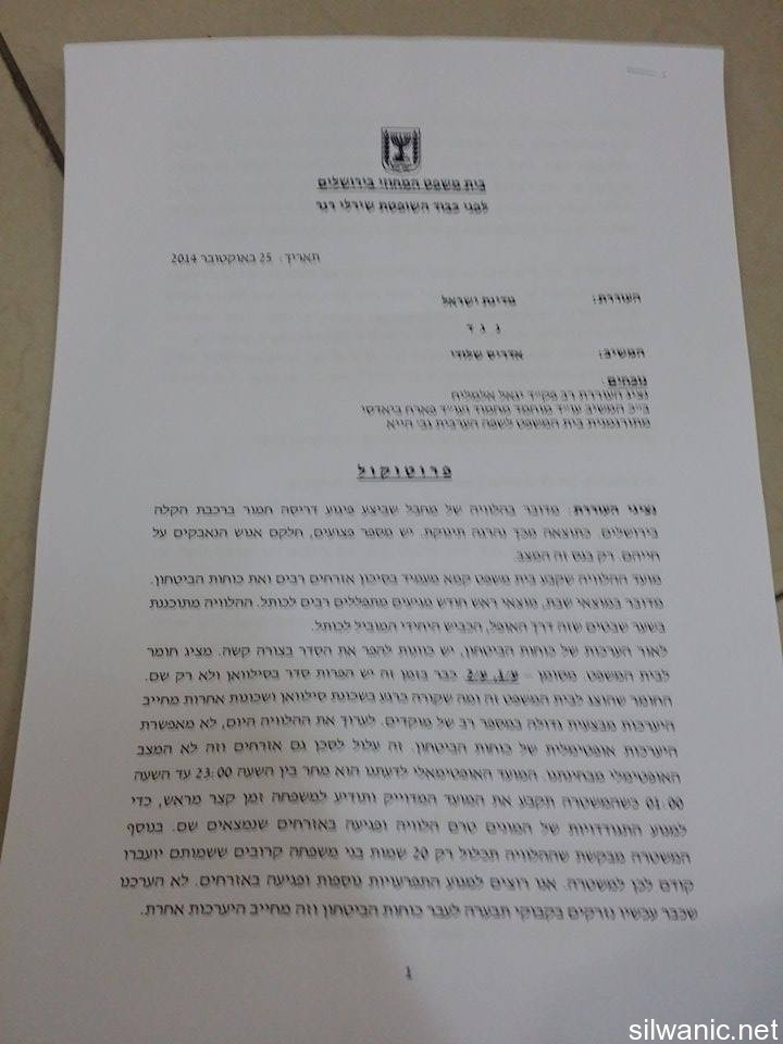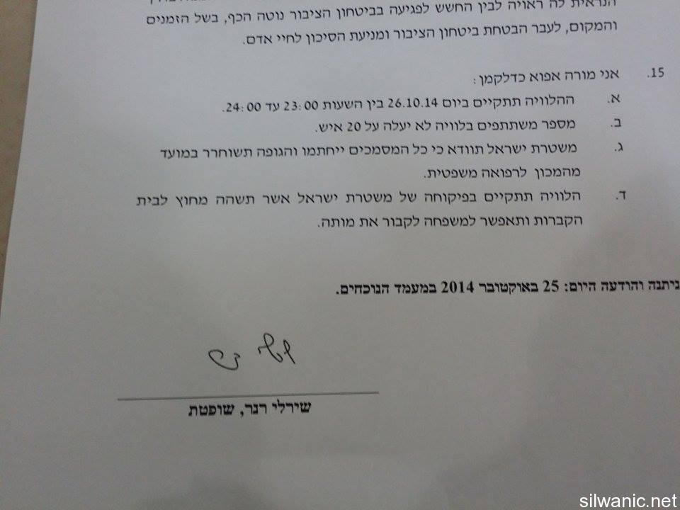 وعقدت المحكمة المركزية اليوم عند حوالي الساعة 8:15 مساء جلسة لسماع استئناف المخابرات على قرار محكمة الصلح القاضي( بتسليم العائلة السبت الساعة ال10 مساءً)، وبعد سماع ادعاء محامي الدفاع عن العائلة والمخابرات، قررت القاضية المذكور أعلاه.