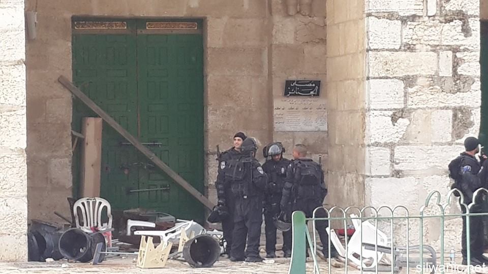 The forces deliberately damaged the contents of Al-Qibali Mosque while they were inside it. They Israeli Special Forces arrested Tarek Hashlamon who is an employee of Al-Awqaf and assaulted him inside the courtyards of Al-Aqsa and several settlers attacked him while exiting through Al-Silsileh Gate.