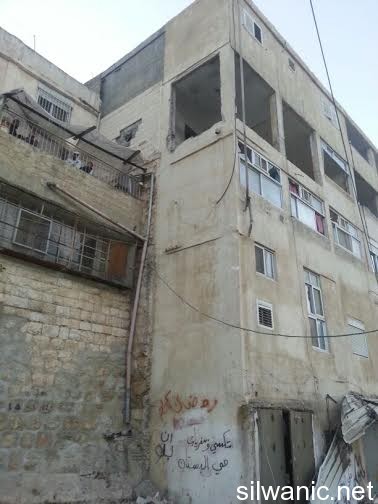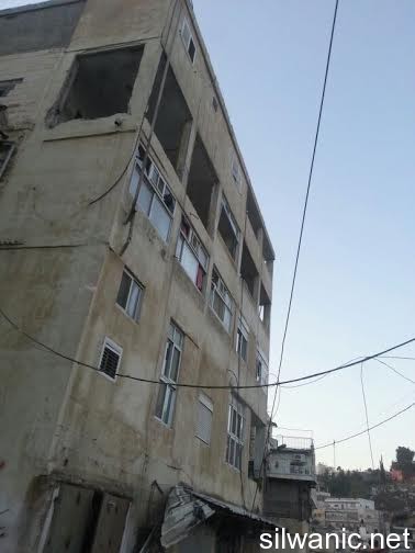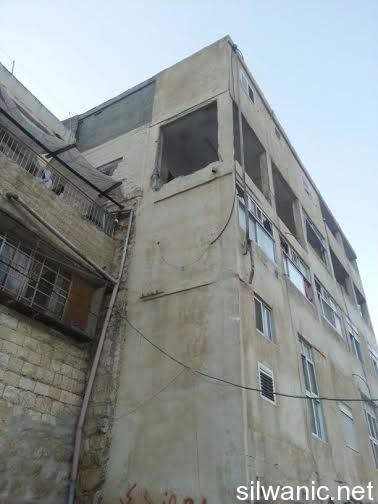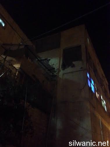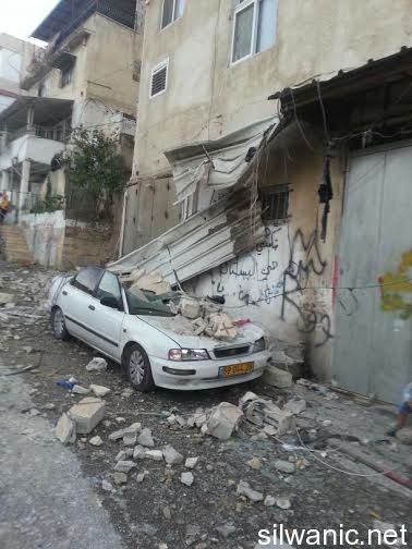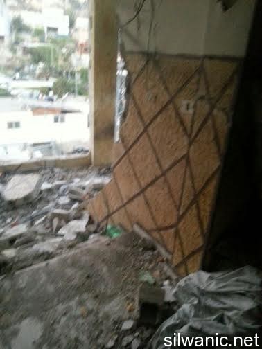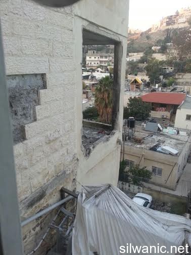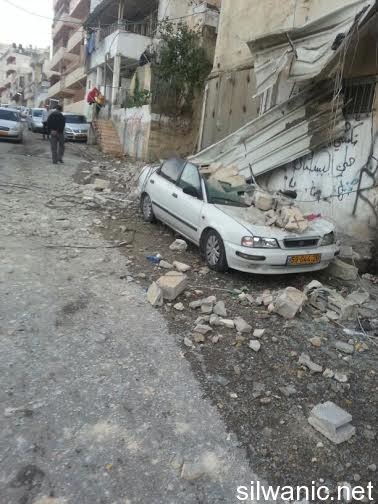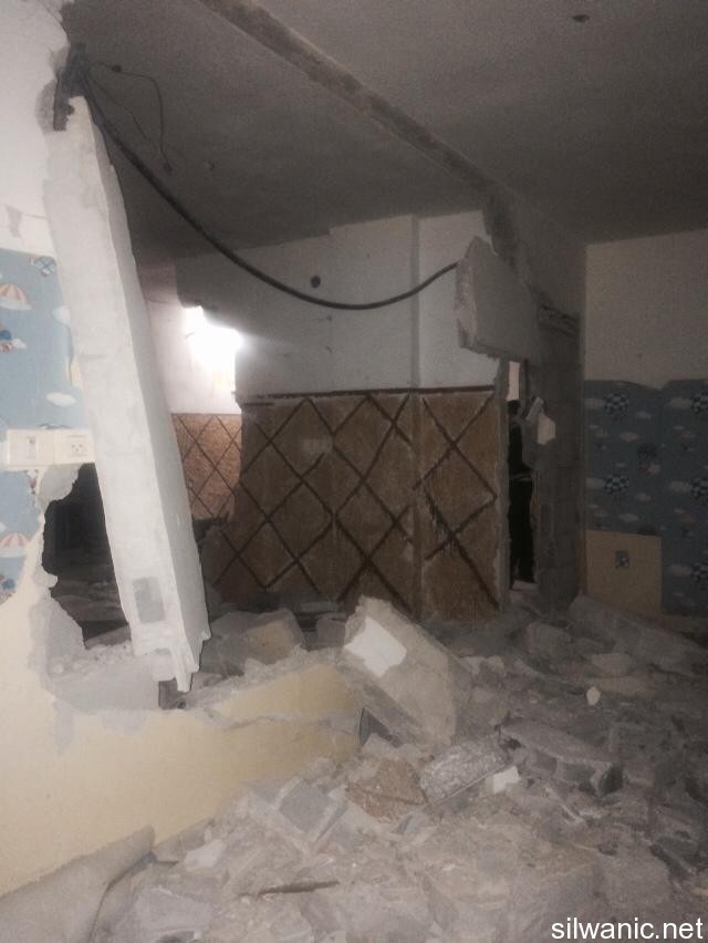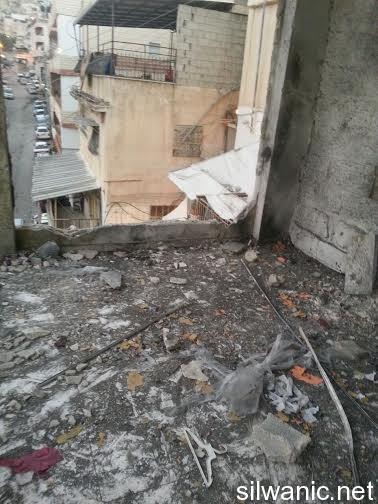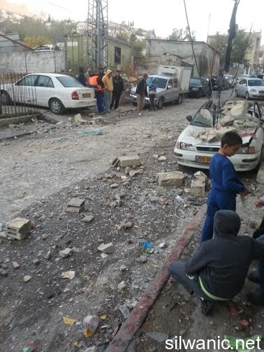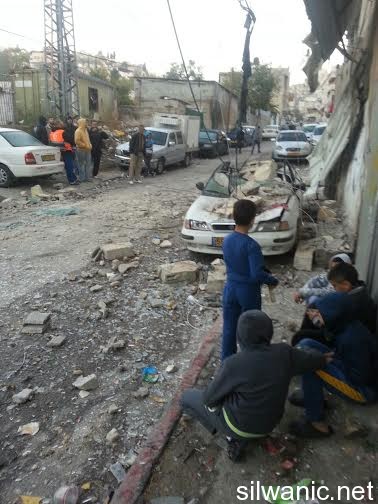 The locals of Silwan did not sleep and the children had a rough night after the Israeli forces raided the neighborhoods of Silwan on Tuesday night and imposed like a “curfew” in order to execute the military order and demolish the house of the Martyr Abdulrahman Shallodi in Al-Bustan neighborhood; note that the Martyr passed away on 22/10/2014 after being shot by the guards of the light trail in Sheikh Jarrah who claimed that he deliberately ran over a group of settlers while he was screaming “unintentional, unintentional”. A huge explosion shook the town of Silwan and the neighboring areas around 4 a.m. after the Israeli forces blew up the house using dynamite leaving damage that looked more like an earthquake had just hit. The occupation authorities are following a new style of demolishing houses as their specialists plant dynamite in the house. The process took from 1 until 4 a.m. and witnesses said that the occupation authorities withdrew from the area after planting the explosives and remotely detonated the house. Wadi Hilweh Information Center confirmed that the occupation authorities did not take into account the houses adjacent to the Martyr’s house and did not think about those houses before carrying out the demolition process. The Martyr’s house is on the fourth floor of a residential building and blowing up the house cause a lot of damage to the neighboring houses. The Center was also informed that the forces increased their presence in Silwan since Tuesday morning and launched the helicopter for several hours and suddenly raided the town after midnight and surrounded the Martyr’s house. The Israeli authorities evacuated the residents of the Shallodi family and three neighboring families (Qaimari, Qa’qoor and Abu Rajab) and forced them to leave and detained them in a tent in Silwan for several hours despite the cold weather; note that they were prevented from moving or leaving the tent all that time. The forces also imposed a cordon in Al-Ein Street, Bi’er Ayoub and Ein Al-Lozeh. After the residents went back to their apartments, they were surprised to find out that the contents of their apartments were searched and damaged. They pointed out that the occupation is trying to punish all Jerusalemites. Damages also occurred to several cars that were parked in the Martyr’s neighborhood after the construction equipment and rocks fell on them.