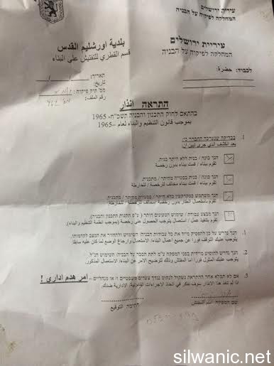 Joint teams of municipality’s employees and occupation forces distributed on Tuesday administrative demolition orders in Silwan. Wadi Hilweh Information Center was informed that the occupation municipality hung three administrative demolition orders on residential houses in the area of “Ras Al-Bustan” in Silwan. The orders did not have the name of the houses’ owners and were randomly hung. According to the information available to the Center, the demolition order were hung on three houses where one of them has been established for 25 years and it is the fifth time where a demolition order is issued against this house, and two other houses that have been established for 7 and 10 years. The municipality’s crews also handed an administrative demolition order to a commercial stored owned by Abbasi family in the neighborhood of Ein Al-Lozeh in Silwan. On the other hand, the head of Elad settlement organization, David Berry, along with the police general inspector carried out a tour to the settlement outpost in the neighborhood of Al-Khalleh in Al-Tur. The police closed several roads and streets in Al-Tur during the tour resulting in heavy traffic in concurrent with the end of the school day.