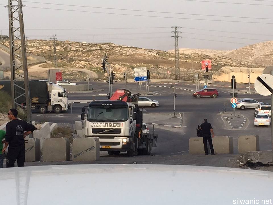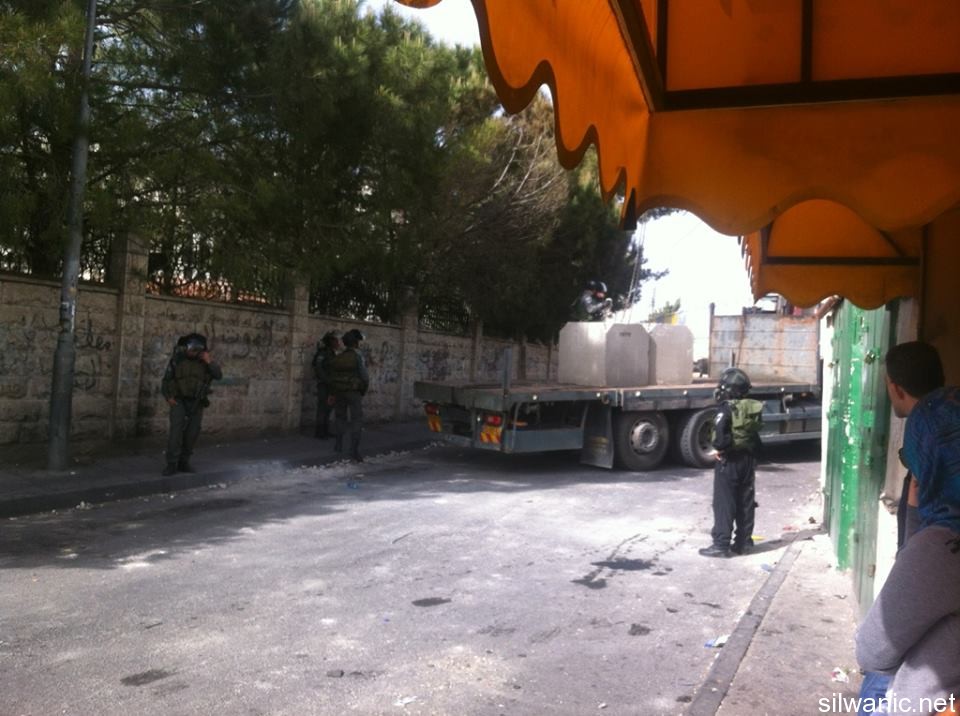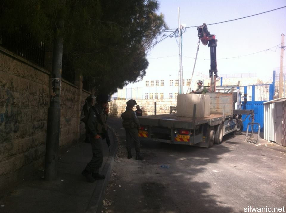 The occupation authorities closed “Suleiman Al-Farisi” Street in the village of Al-Tur and the eastern entrance of the village of Esawyeh with cement blocks. The follow-up committees in both villages explained that the occupation forces closed “Suleiman Al-Farisi” Street in Al-Tur and the eastern entrance of Esawyeh with cement blocks as a “collective punishment” to the locals because of the breakout of clashes and throwing stones in the villages; note that the street that was closed in Al-Tur is the same street where the run-over incident occurred last Saturday night. The head of follow-up committee in Al-Tur explained the ““Suleiman Al-Farisi” Street is considered the main street of “Khallet Al-Ein” where 3500 people live and there are two schools in the street (elementary with more than 1200 students). Also, there is the cemetery of Mount of Olives and “Suleiman Al-Farisi” Mosque which is one of the main mosques in the area and Mount of Olives Club. Mohammad Abu Hummos, member of follow-up committee in Esawyeh, explained that the occupation forces partly closed (sides only) the entrance of the village and pointed out that the partial closure is more like a full closure because it will lead to heavy traffic jams in the street that is used by hundreds of vehicles daily. The closure also made it very hard on busses to go and out of the village.