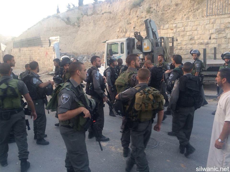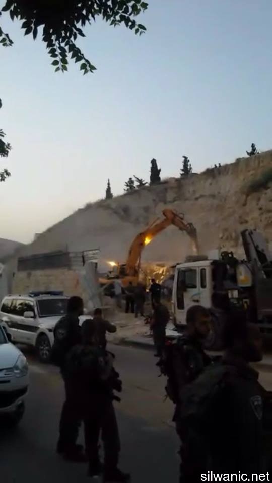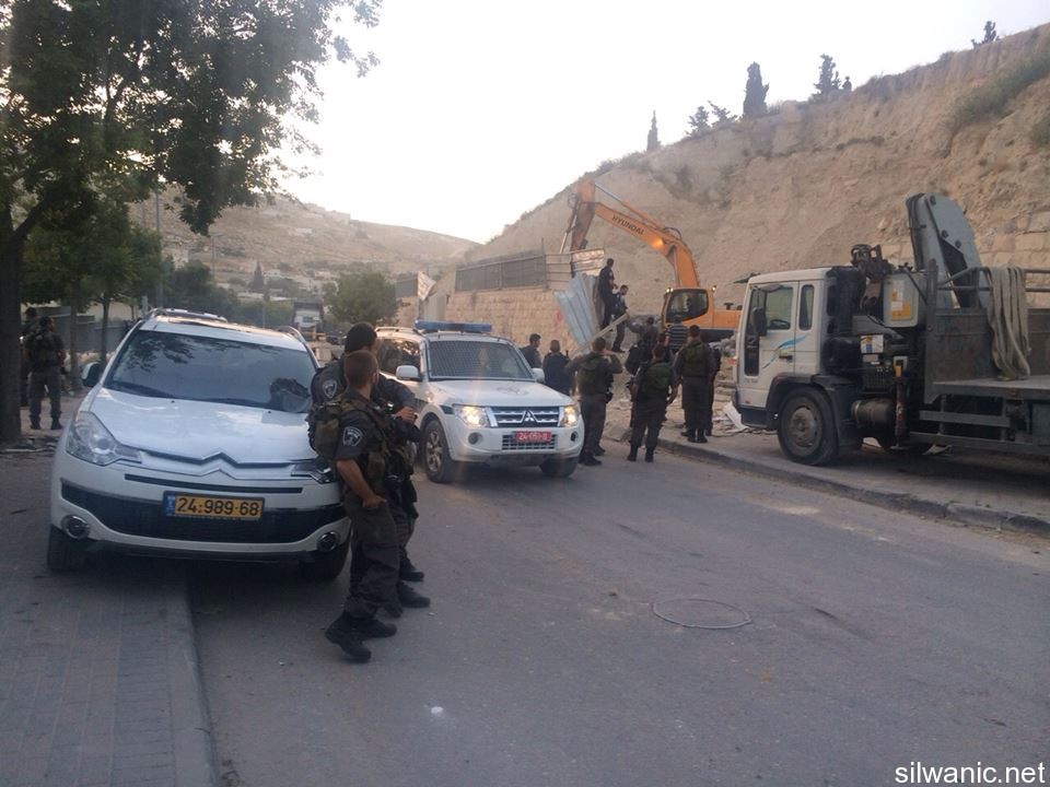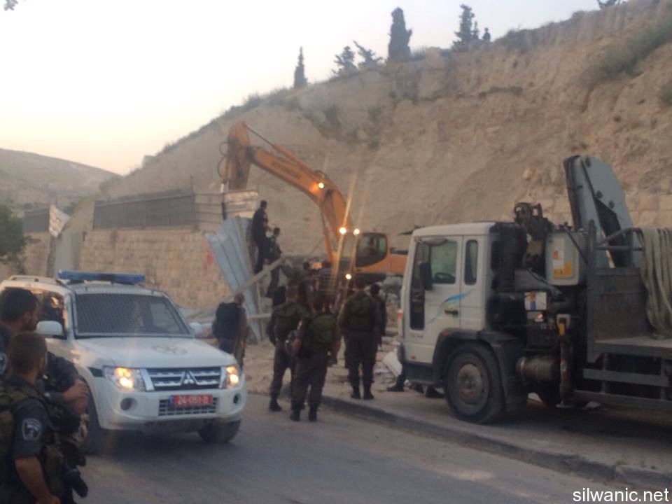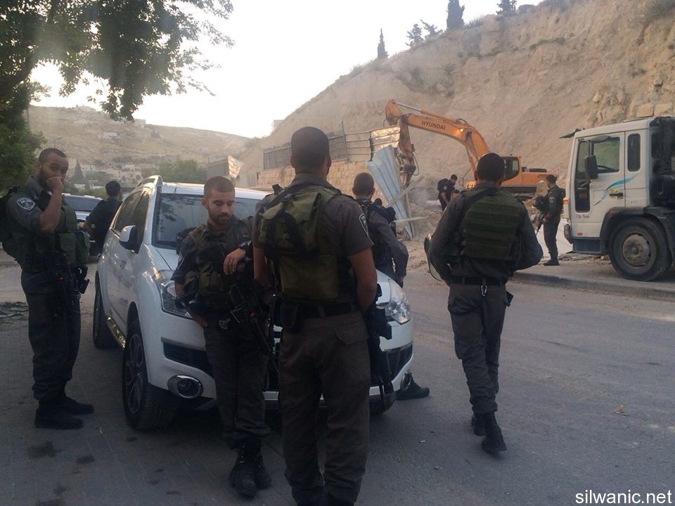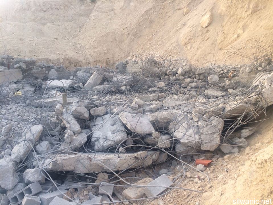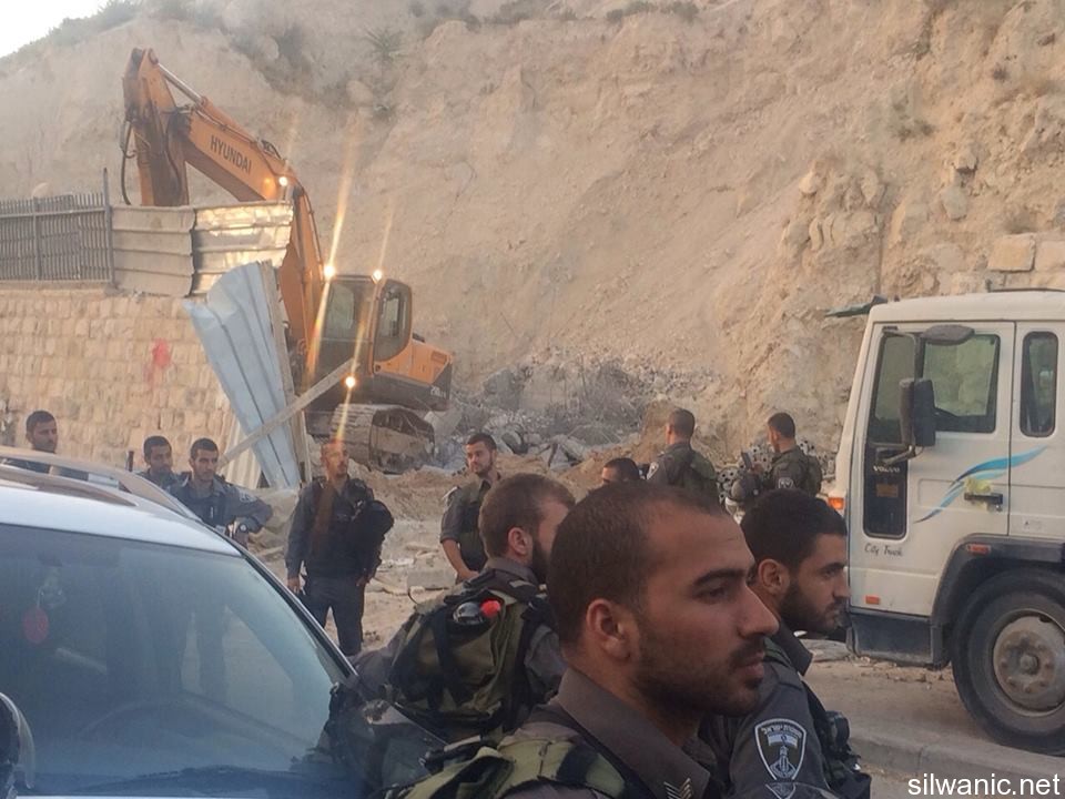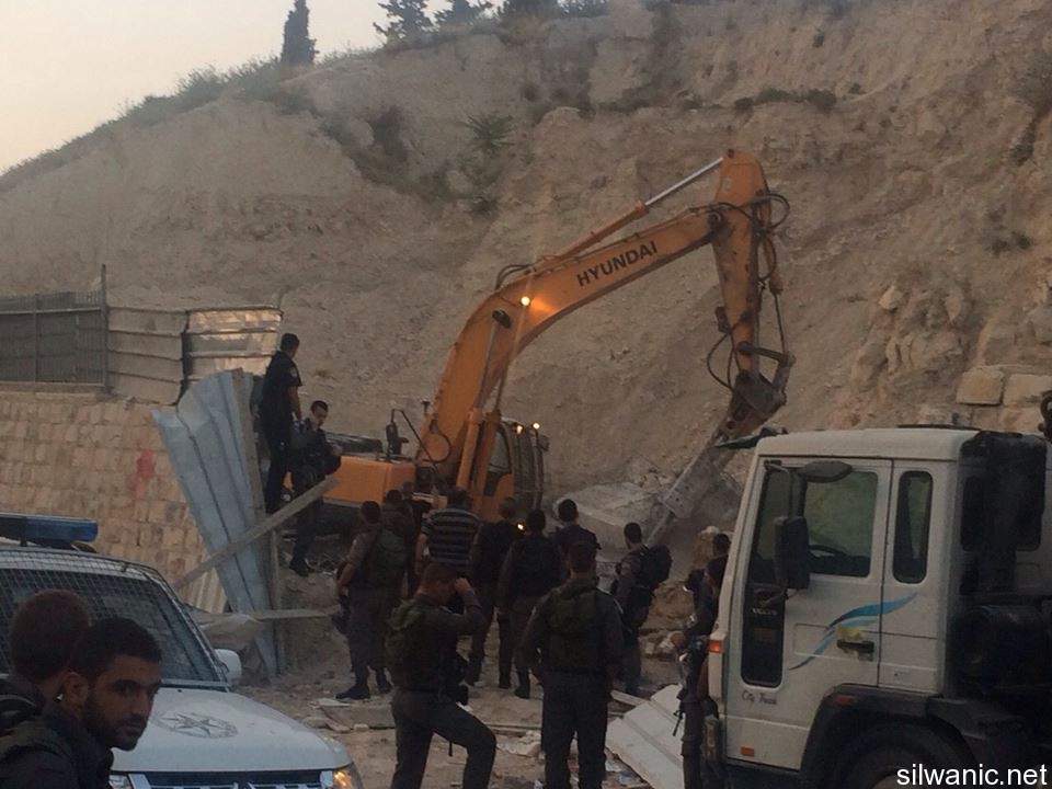 The occupation municipality’s bulldozers demolished on Tuesday early morning three commercial stores in the neighborhood of Ein Al-Lozeh in Silwan under the pretext of building without a permit. Wadi Hilweh Information Center was informed that a large Israeli force including Special Forces and borders police along with a bulldozer raided the village of Silwan around 4 a.m. and surrounded the neighborhood of Ein Al-Lozeh (Hosh Abu Tayeh) and closed the roads leading to it and prevented citizens from approaching the area. The demolition was then executed in which three commercial stores and one under-construction apartment all owned by Anis Karameh were demolished. The occupation forces prevented Anis Karameh from approaching his stores and tried to assault him. Karameh explained that he had just finished building the stores two months ago which are not being used yet; the stores area is 200 square meters. Karameh added that the occupation’s bulldozer executed the demolition on top of construction tools, stones and bricks that were inside the stores. The residents warned of the danger of demolishing shops in the area which serves as supporting walls to a mounting in the “Hosh” and expressed their fears of the collapse of the mountain.