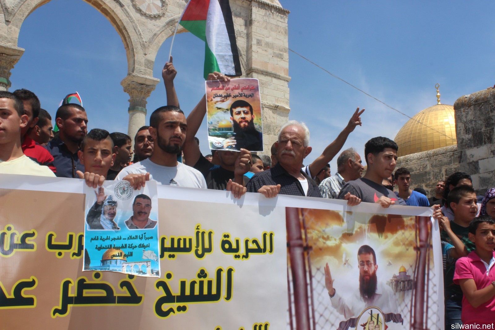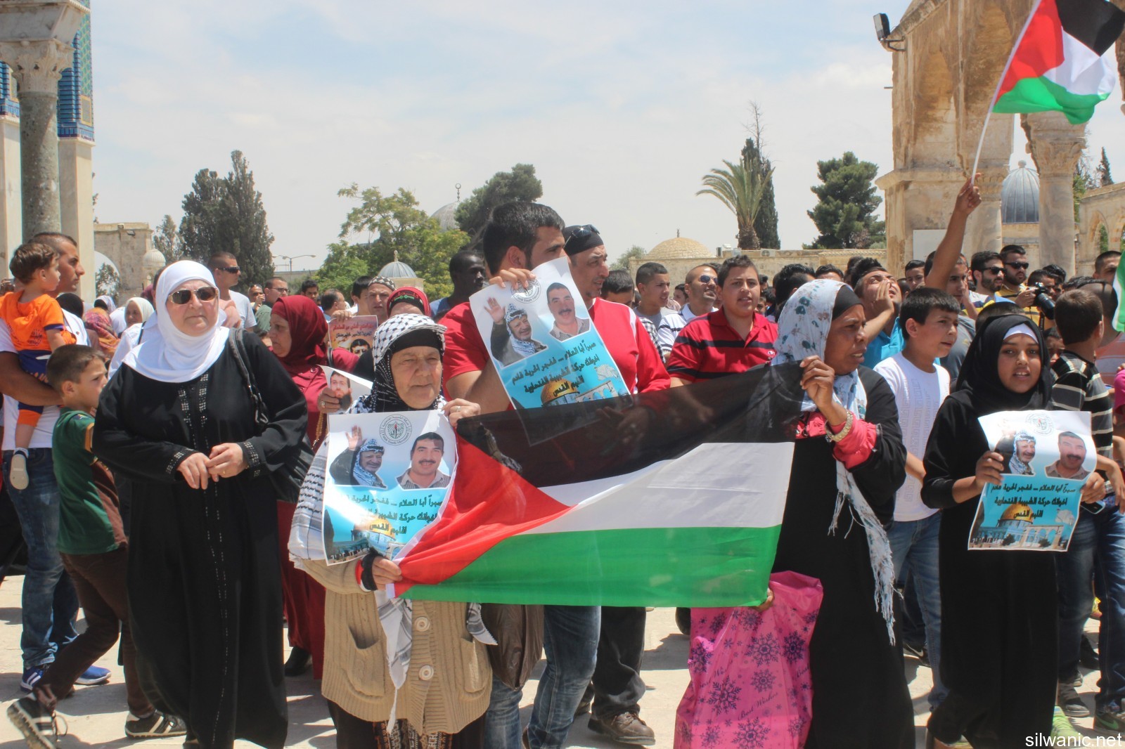 The Popular Youth Movement called for the march inside Al-Aqsa and participants walked from Al-Qibali Mosque towards the courtyard of the Dome of the Rock and raised Palestinian flags as well as pictures of the Jerusalemite prisoner Khader Adnan. Participants also raised pictures of the prisoner Ayman Sharabati who has been isolated for nearly a month under the pretext of burning the Israeli flag.