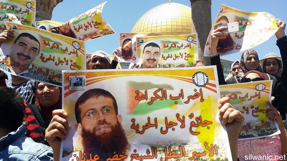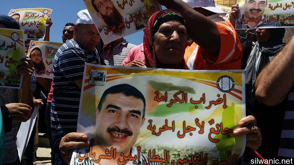 The Prisoner’s Club in Jerusalem and the Jerusalemites detainees and prisoners families committee organized on Friday a sit-in in solidarity with the prisoners in the occupation’s prison. Dozens of Jerusalemites held pictures of the two prisoners who are currently on hunger strike, Khader Adnan and the Jerusalemite Ayman Sharabati, and chanted for them and their freedom. They also chanted for the steadfastness of the prisoners in Israeli jails. Prisoner Ayman Sharabati The 47-year old Ayman Ribhi Sharabati was arrested on 17/3/1998 and was sentenced for life in prison after he was convicted of carrying out several attacks against settlers in the Old City of Jerusalem that led to the death of one settler and injury of another. He was also convicted of membership in Fateh Movement. Ayman has four children and when he was arrested he had three as his wife was still pregnant. The occupation prison’s administration isolated Sharabati after accusing him of burning the Israeli flag and he has been on hunger strike since the beginning of June to condemn the policy of solitary confinement and the difficult conditions our prisoners suffer inside the Israeli jails. Prisoner Khader Adnan The 37-year old prisoner Khader Adnan has been on hunger strike for 46 days to condemn his administrative arrest. He is currently detained in “Assaf Harofeh” hospital in the Department of Internal Medicine and is suffering a serious deterioration of his health.