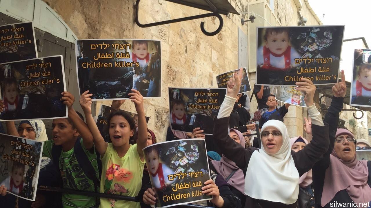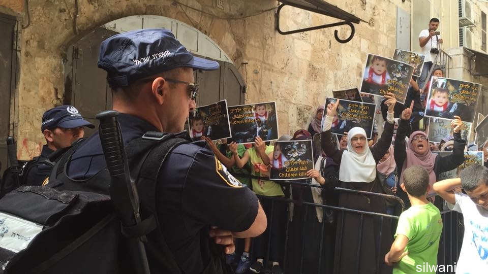 The occupation forces assaulted the Marabouts near Al-Silsileh gate and pushed them. The Marabouts help pictures of the baby Martyr Ali Dawabsheh who was burned alive after settlers attacked his family’s house in the village of Duma in Nablus; note that his parents and brother also suffered critical burns.