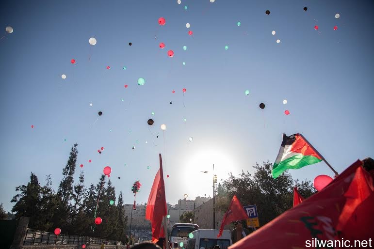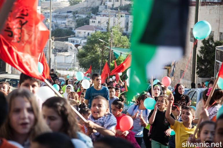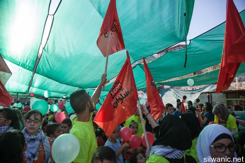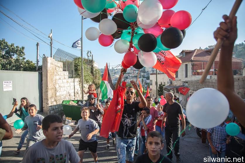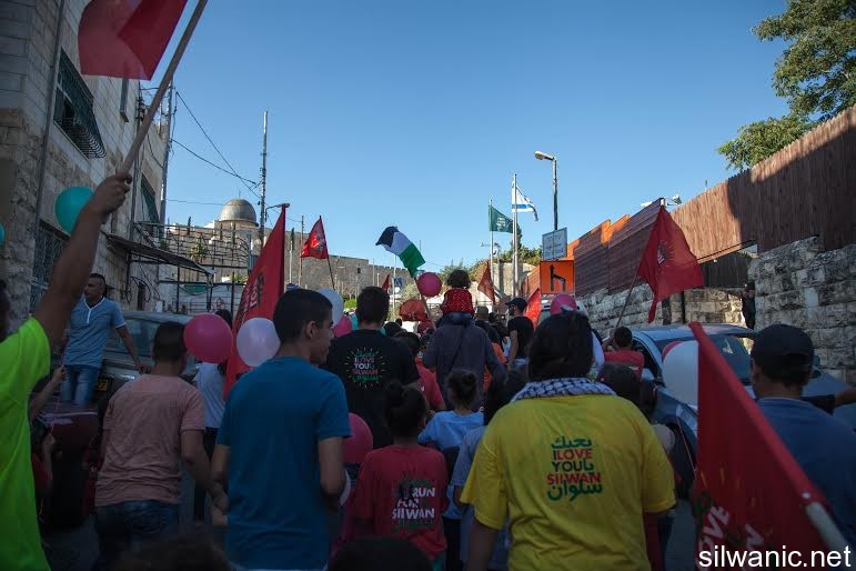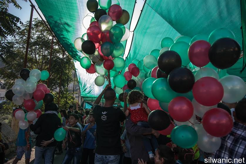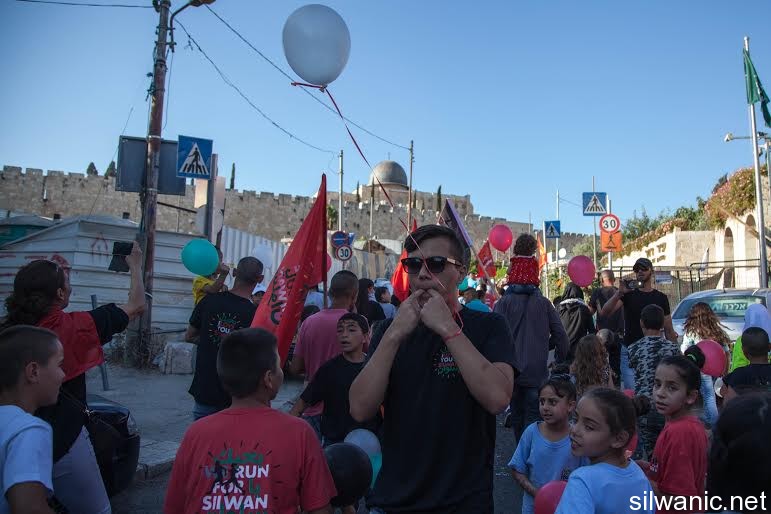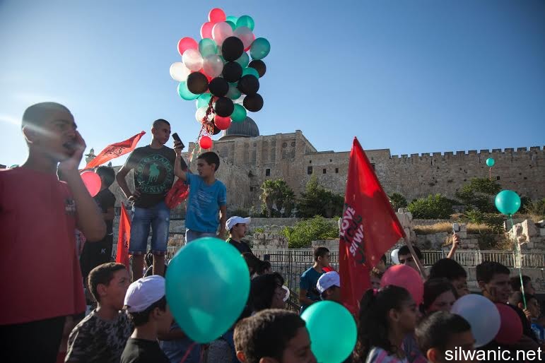The march initiated from Wadi Hilweh playground and walked in the streets of the neighbourhood reaching the area of Umayyad palaces adjacent to the southern wall of Al-Aqsa Mosque. The participants launched balloons with the Palestinian flag's colors and chanted slogans for Jerusalem, Silwan and Al-Aqsa.