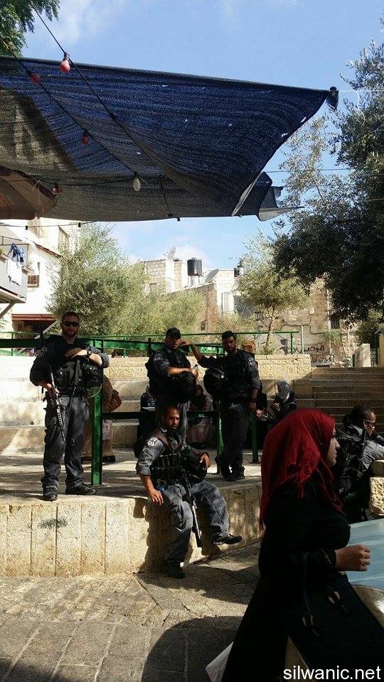 The occupation authorities closed on Monday morning most of Al-Aqsa Mosque’s gates and prevented the students of female religious schools and children under the age of 17 from entering Al-Aqsa while settlers were allowed to break-in through Dung Gate. Wadi Hilweh Information Center was informed that the occupation police closed most of Al-Aqsa Gates except for Hutta, Al-Majles and Al-Silsileh Gates and prevented all children females of religious schools from entering Al-Aqsa; note that they detained the IDs of several young men before allowing them in. Witnesses added that the occupation police established checkpoints and deployed its forces at Al-Aqsa gates that were left open. Witnesses added that groups of settlers broke into Al-Aqsa through Dung Gate and were protected by the Israeli police amid chants of “God is Great” by the worshippers who managed to enter the Mosque. Women gathered at Al-Silsileh Gate after they were prevented from entering and the forced used force to push them away from the area. Witnesses said that the police arrested a girl from the area of Bab Hutta near Al-Aqsa Mosque. On the other hand, the forces arrested the 14-year old Qusai Dari after aiding his house in the village of Esawyeh.