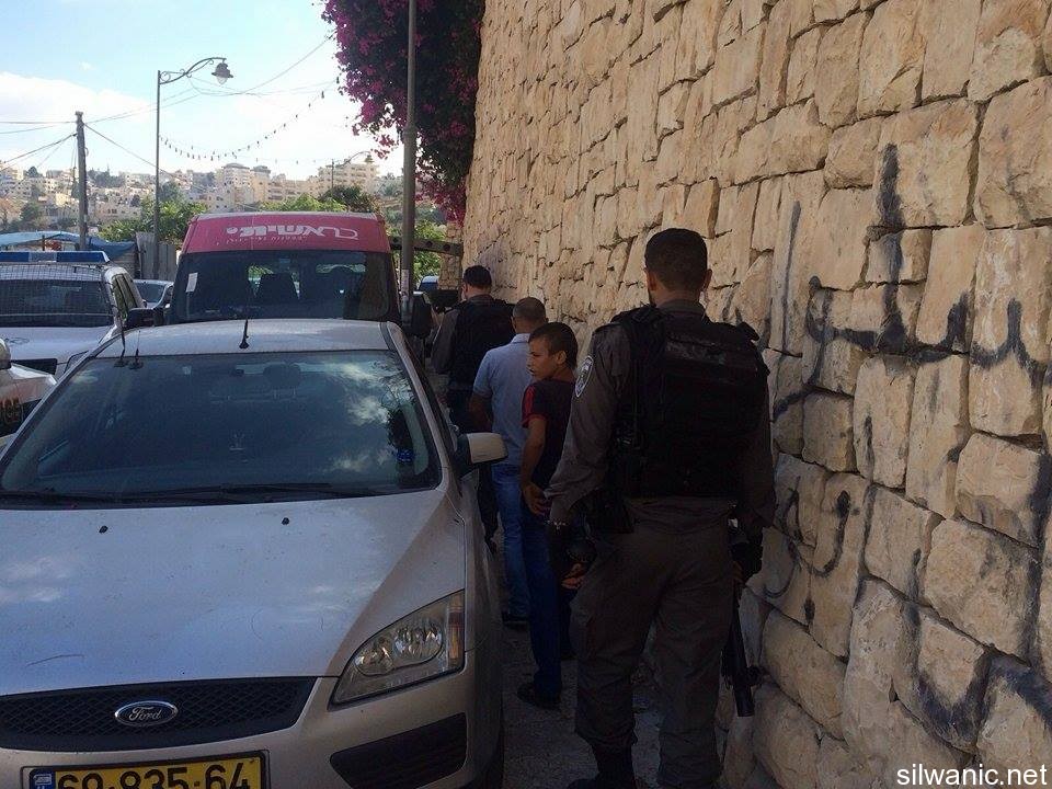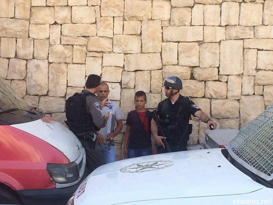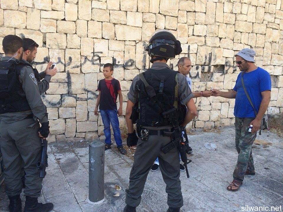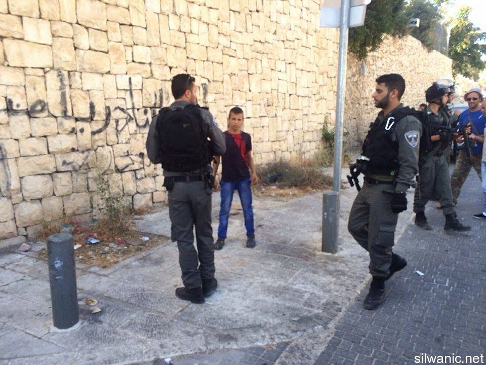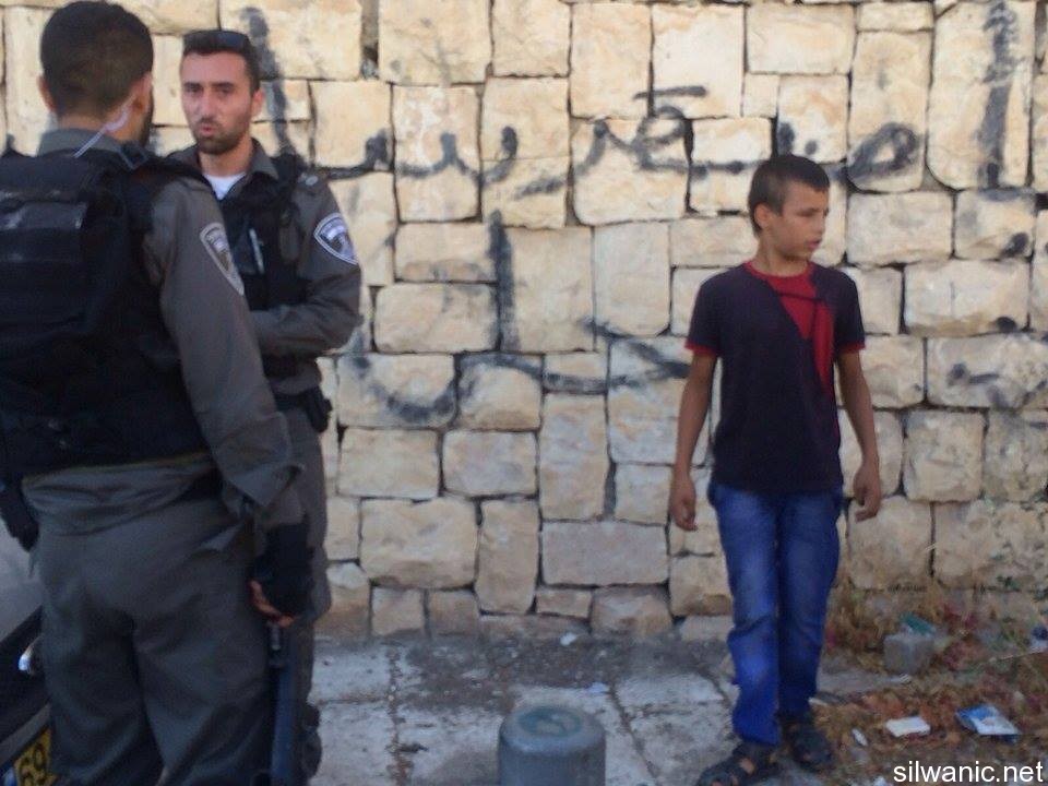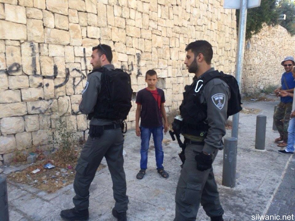 The occupation police attempted on Tuesday afternoon to arrest the 13-year old Mutasem Abu Nab under the pretext of throwing stones at settlers. Wadi Hilweh Information Center’s staff was informed that the occupation forces detained the child Abu Nab for nearly 40 minutes in Al-Ein Street in Silwan under the pretext of throwing stones at setters; note that no settlers were present in the area before and during the detention. The forces interrogated the child in the street and detained his 18-year old brother Mohannad under the pretext of “obstructing police work”.