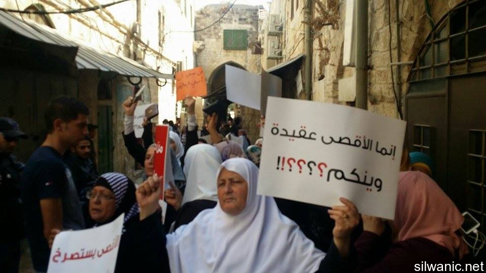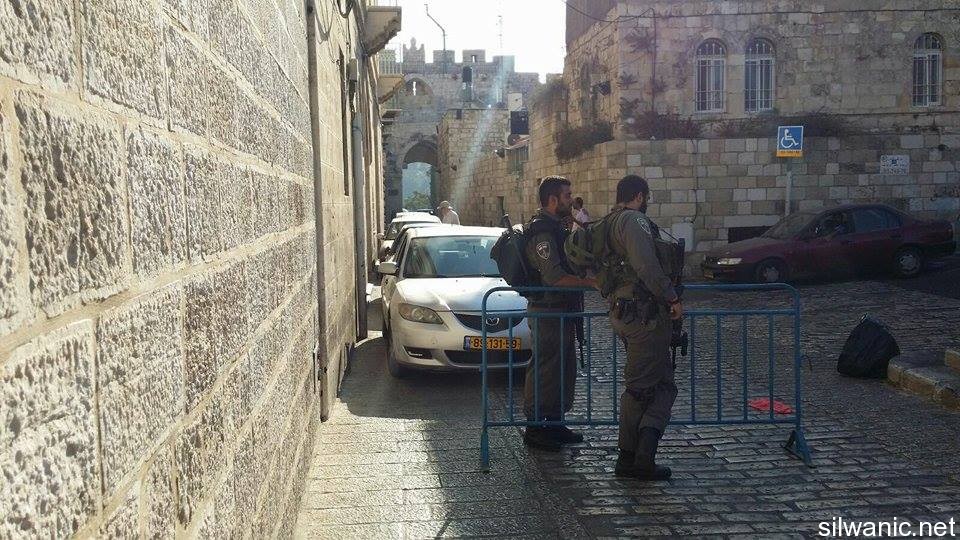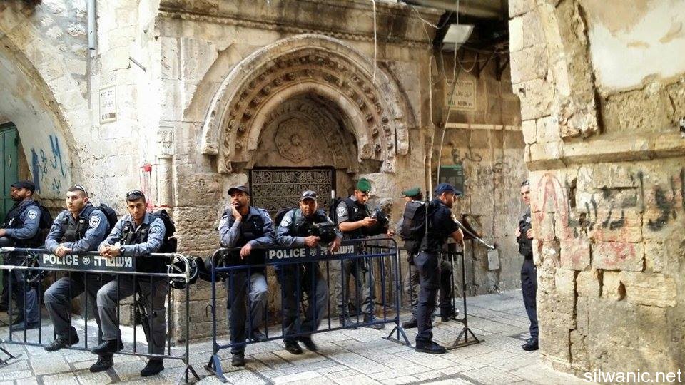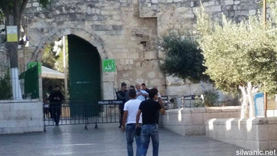 The occupation authorities prevented on Tuesday all Muslims from entering Al-Aqsa Mosque and allowed the settlers to break-in and carry out their tours into its courtyards. Dozens of women, young men and old people remained stationed at Al-Aqsa gates after they were barred from entering in order to confirm their right to enter Al-Aqsa. They raised banners requesting to enter Al-Aqsa without any restrictions. The occupation forces assaulted the Marabouts and pushed them and also targeted the press crews and prevented them from doing their work and monitoring the ongoing events at Al-Aqsa gates. The police arrested three young men from Al-Aqsa gates on Tuesday (Obada Najib, Abdel Karim Haddad and Mohammad Za’tari) and detained Ala’ Haddad who is a member of the Jerusalemites detainees and prisoners families committee.