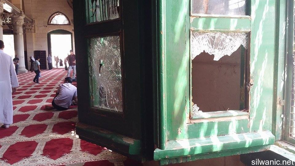 Wadi Hilweh Information Center was informed that dozes of occupation Special Forces raided Al-Aqsa Mosque and targeted the people present in the courtyards with sound grenades and rubber bullets. Within moments, the forces raided Al-Qibali Mosque where the young men and worshippers were stationed, and stepped on the Mosque’s carpets with their shoes and heavily fired sound grenades. The forces then arrested several young men and transferred them to the detention centers through Dung Gate.