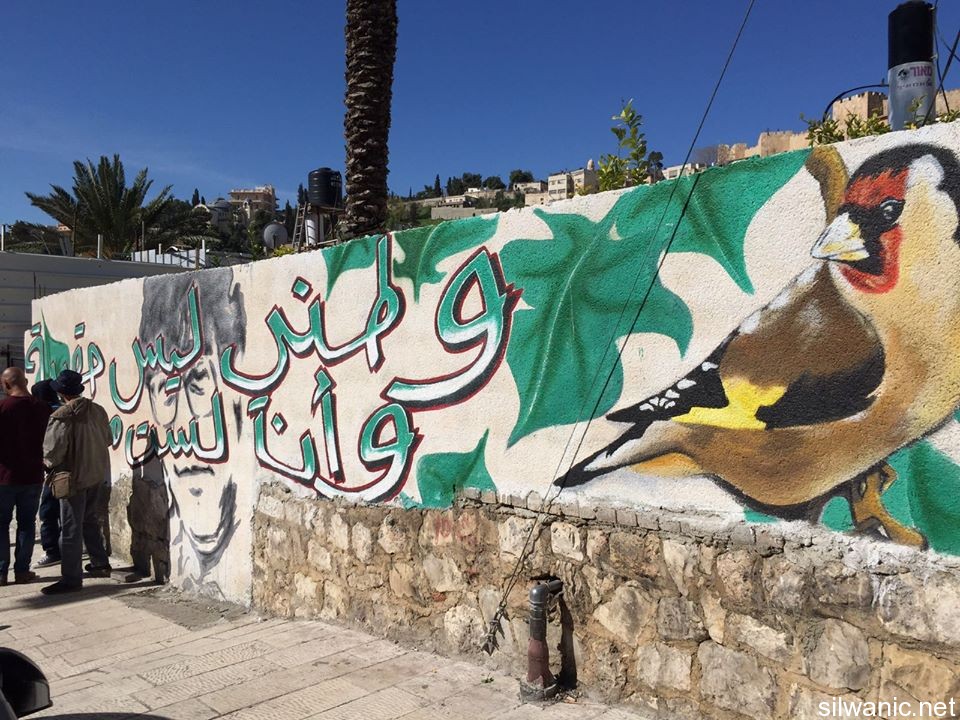 كما غطت الأعلام الفلسطينية وشعار "بحبك يا سلوان" العديد من الجدران، إضافة الى حق العودة، وحنظلة كما رسمت صورة للشاعر الفلسطيني الراحل محمود درويش وخطت بعض أشعاره التي تؤكد على التمسك بالأرض والحفاظ