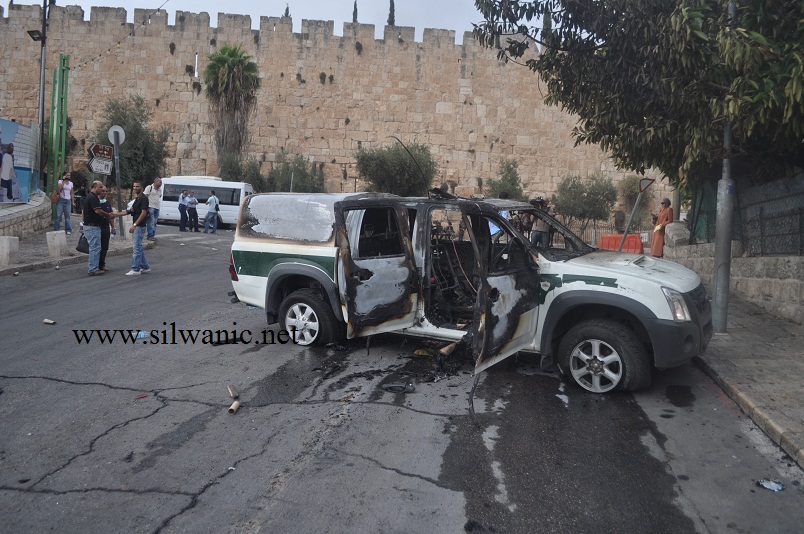 سيارة شرطة إسرائيلية  أحرقت خلال جنازة الشهيد سامر سرحان على بعد بضع أمتار من سور المسجد الأقصى