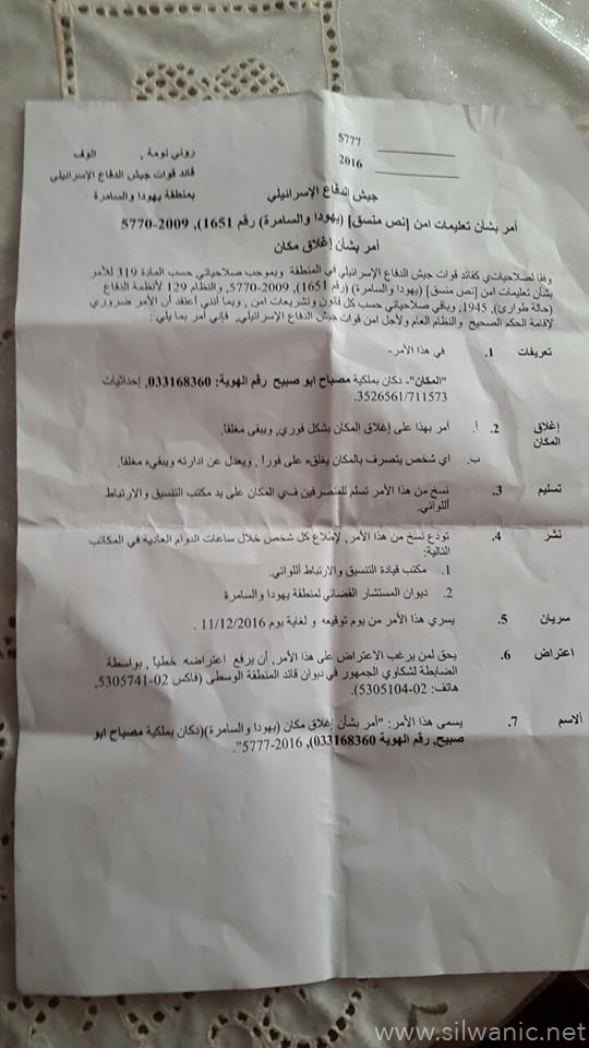 وحسب القرار الذي علق على أبواب المحلات التجارية والمخازن، فإن قرار "أمر بشأن إغلاق المكان" جاء حسب المادة 319 بشأن إغلاق مكان، وحسب أنظمة الطوارئ عام 1948... وجاء فيه ان الأمر ضروري لإقامة الحكم الصحيح والنظام العام ولأجل امن القوات الجيش".
