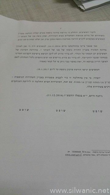 وطالبت المحكمة العليا من النيابة العامة الرد بشأن جثمان الشهيد أبو سرور بإبلاغها بشأن التسليم أو عدمه حتى تاريخ 10-1-2017.
