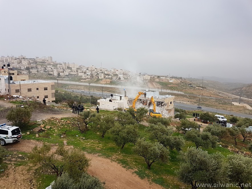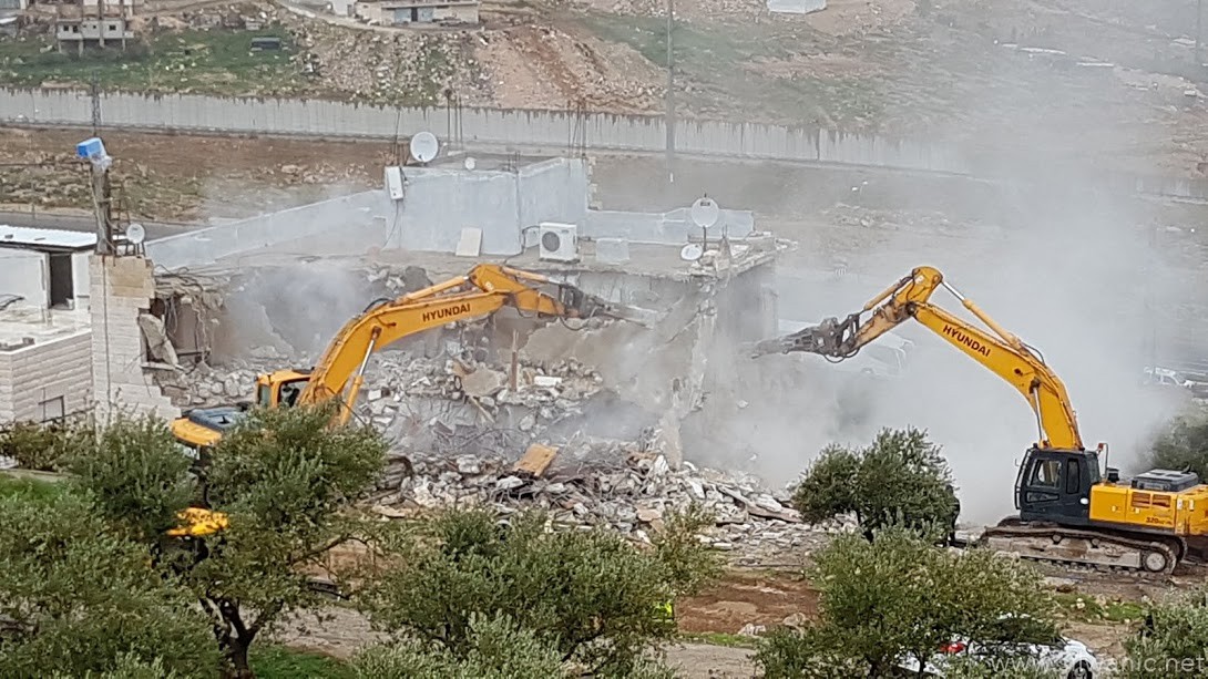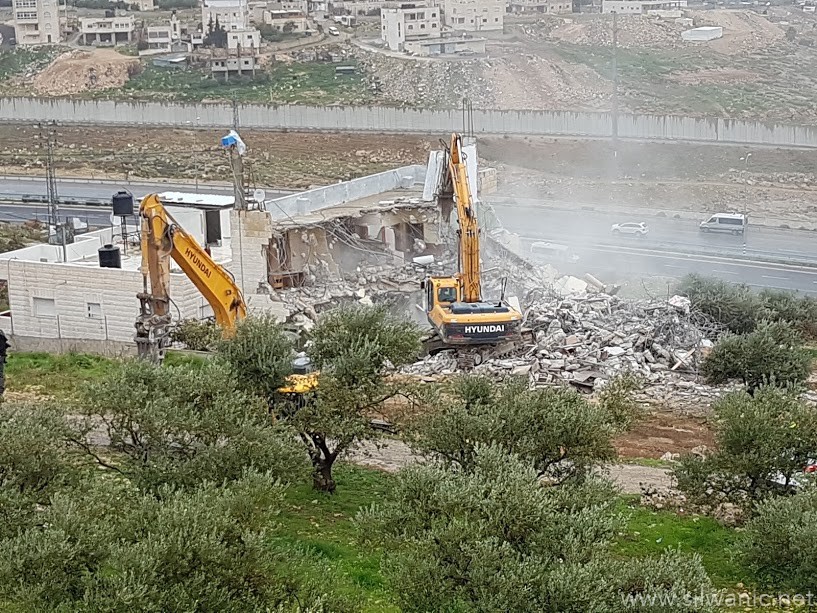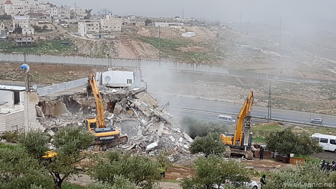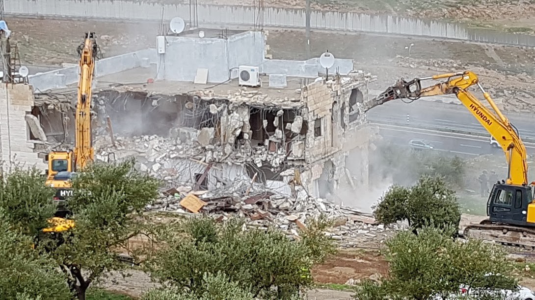 The occupation municipality’s bulldozers demolished on Wednesday morning a residential building owned by Khaled Nimer Mahmoud in the village of Esawyeh under the pretext of building without a permit.