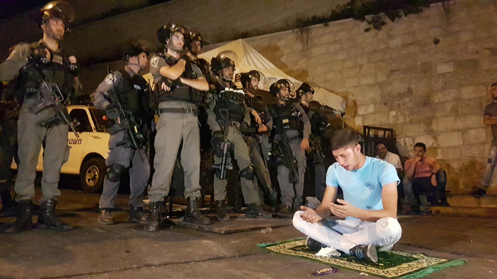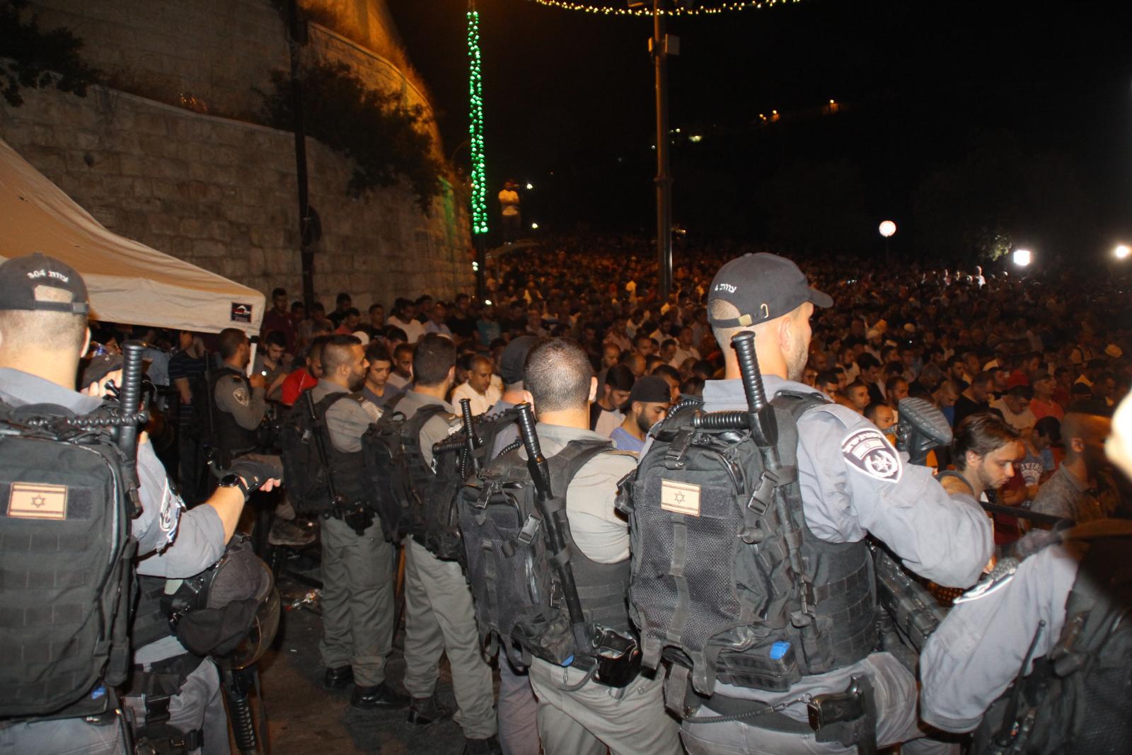 Wadi Hilweh Information Center said the occupation authorities escalated in an unprecedented manner their violations at Al-Aqsa Mosque by closing it and preventing the Call for Prayer for two full days and prevented the Friday Prayer from being held in addition to their attempt to impose inspection procedures for expatriates, which led to a wave of anger represented in demonstrating in front of Al-Majles and Lions gates. Thousands of Palestinians prayed in the streets and alleyways, and the occupation authorities launched a massive campaign of arrests and deportations from Jerusalem and al-Aqsa in July, in addition to the continued demolition of establishments in the city.