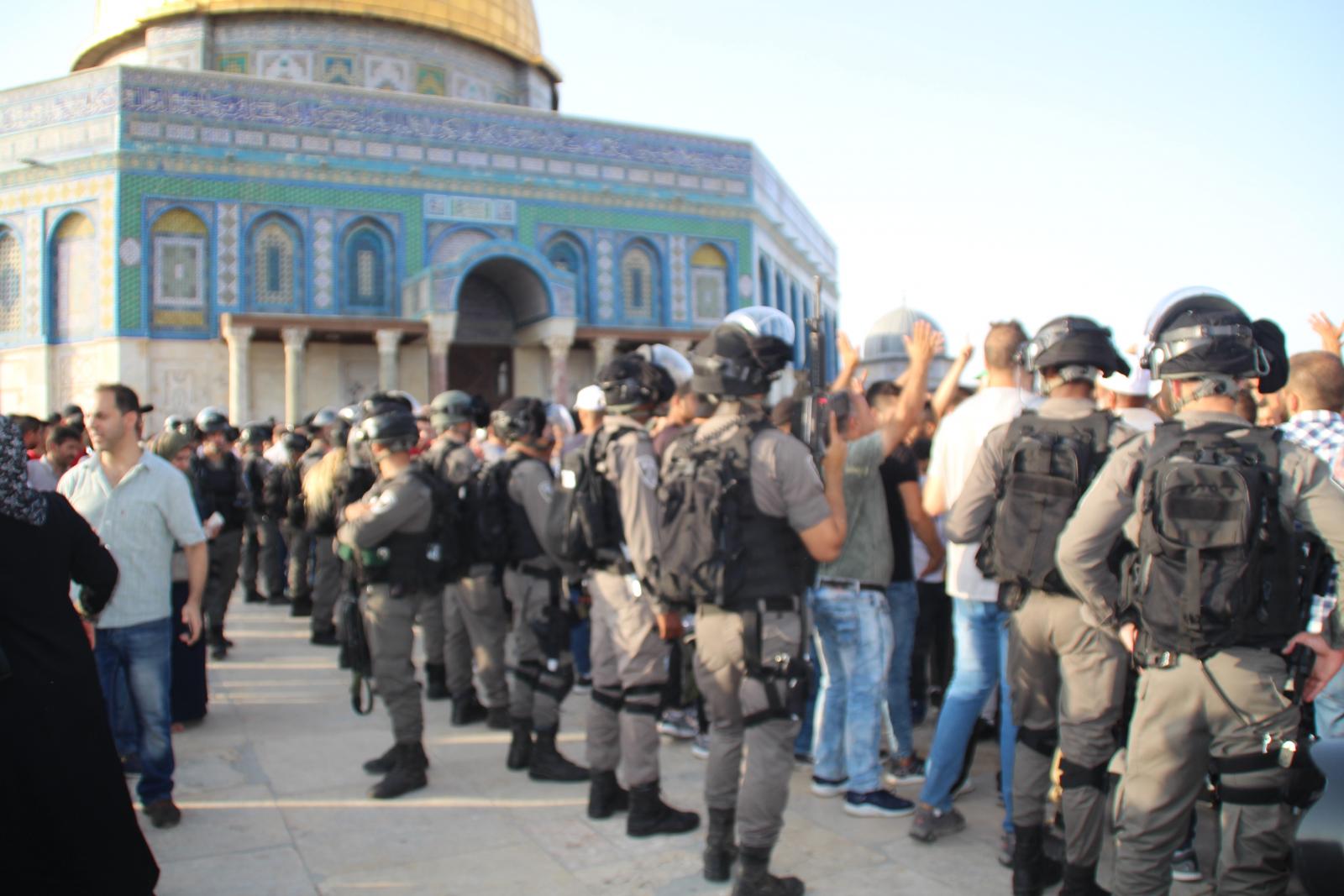 On the 27th of July and after the religious officials’ decision to enter Al-Aqsa, the occupation tried to prevent the guards from opening the Hutta Gate. Tens of thousands of Palestinians managed to enter the Aqsa through Hutta Gate and Lions Gate, and then the heavily armed forced stormed into the mosque and assaulted worshipers with sound grenades, rubber bullets and sprayed them with pepper gas and also beat and pushed in an attempt to evacuate the mosque. After the Night Prayer, the forces stormed into Al-Aqsa and arrested all those present in Al-Qibali Mosque to prevent them from staying overnight.
