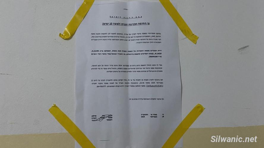 The Israeli occupation authorities closed the home of the Jerusalemite martyr Fadi Jamjoum, in the Shu’fat refugee camp in Jerusalem, by a decision of the commander of the Home Front, and the Israeli authorities posted the "confiscation and temporary closure for 10 days" order on the door of the house.