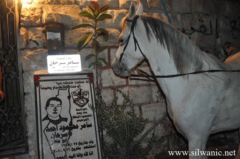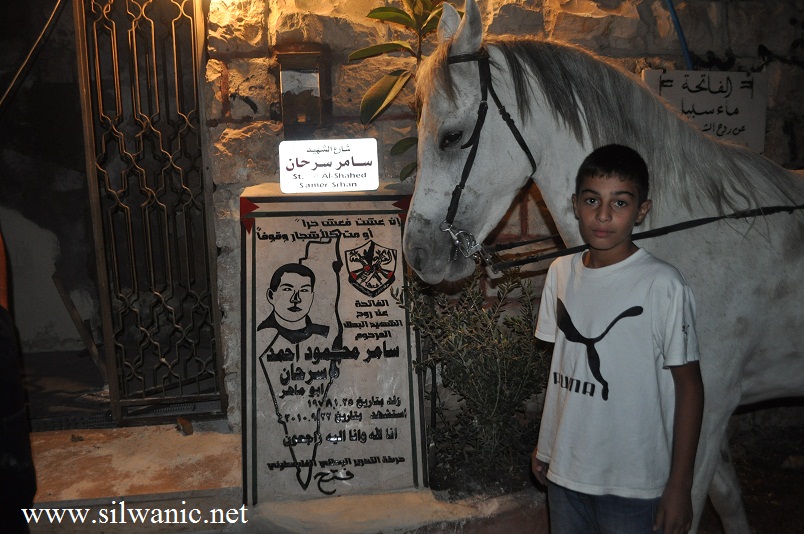 ماهر الابن البكر للشهيد سامر سرحان يقف مع فرس والده امام النصب التذكاري